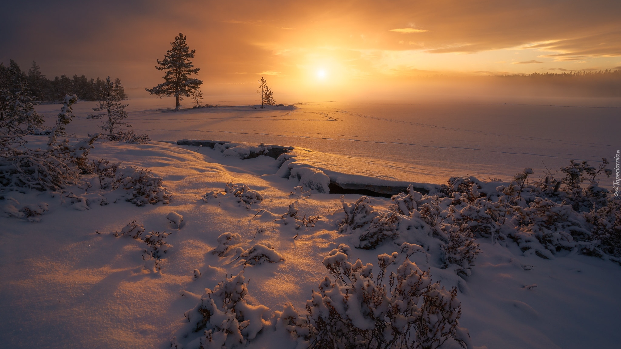 Edytor tapety: Drzewa nad zaśnieżonym jeziorem w Ringerike