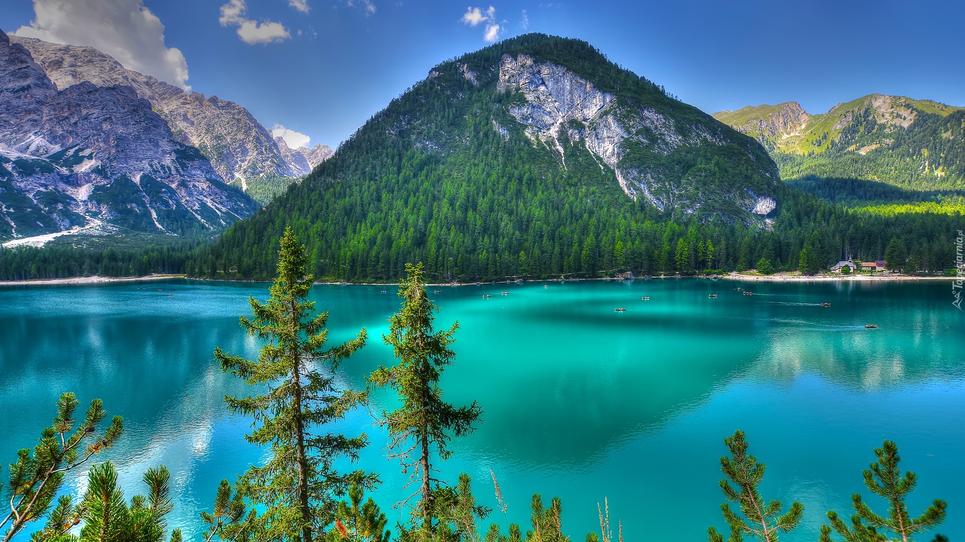 Edytor tapety: Widok na jezioro i zalesioną górę