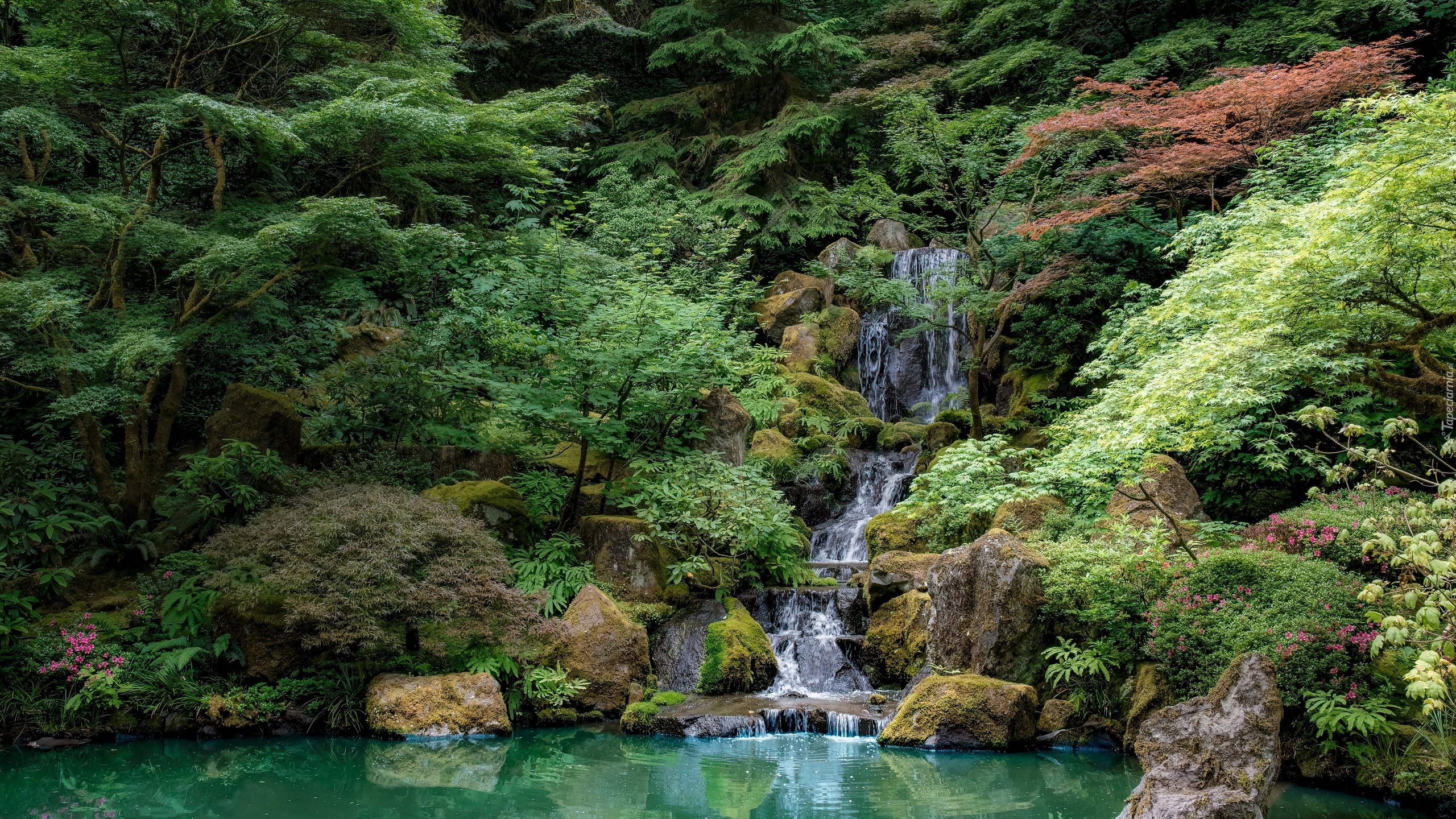 Edytor tapety: Kaskadowy wodospad wśród drzew