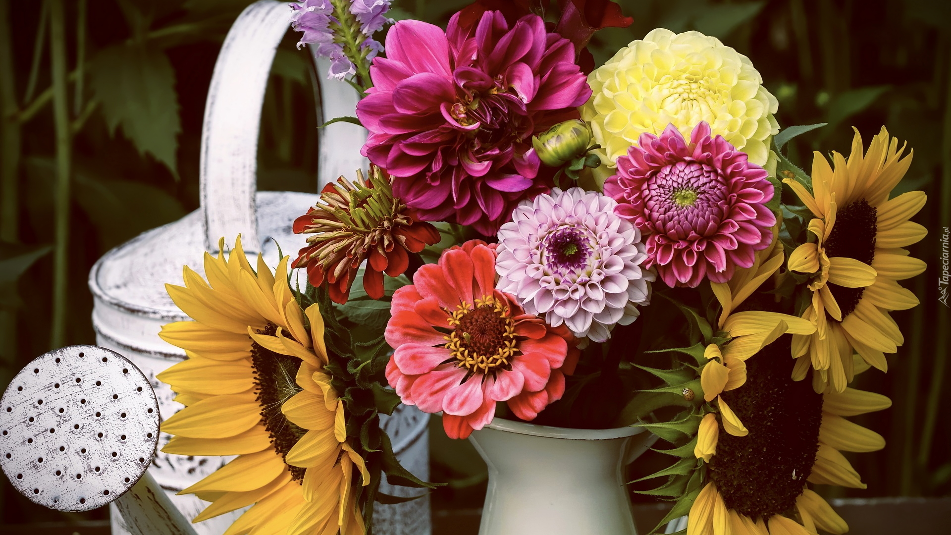 Edytor tapety: Kolorowe kwiaty w dzbanku obok konewki