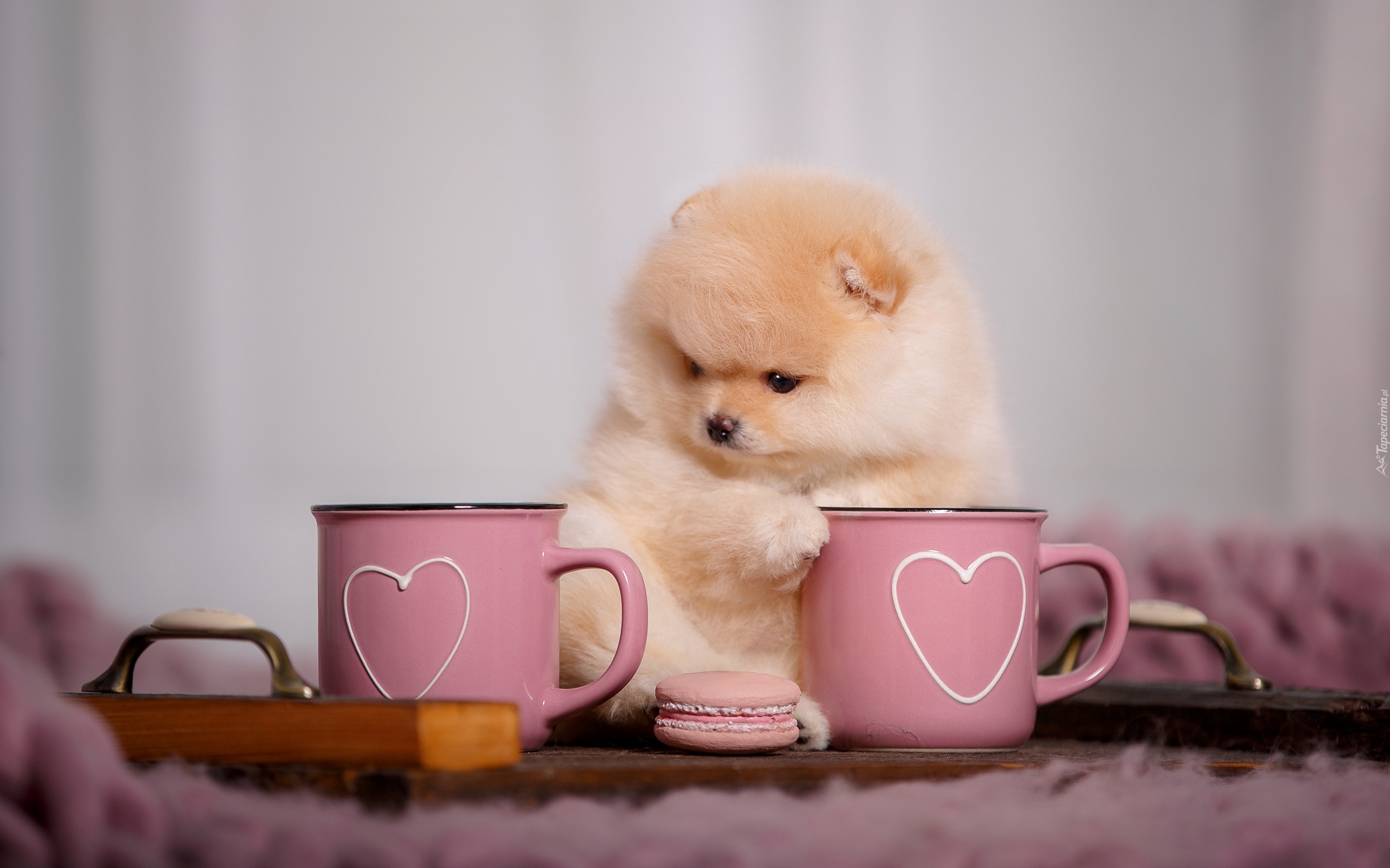 Edytor tapety: Szczeniak szpica miniaturowego obok kubków