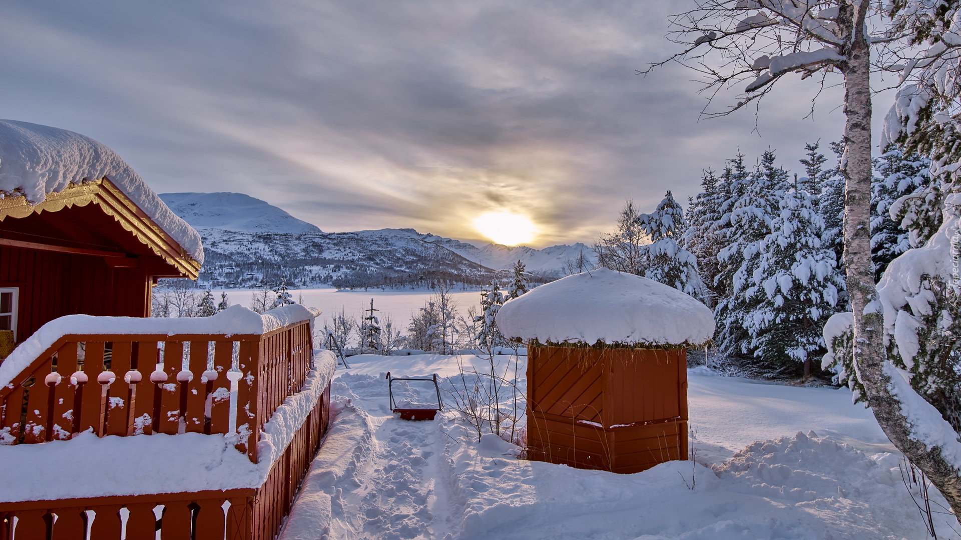 Edytor tapety: Ośnieżony dom za czerwonym ogrodzeniem