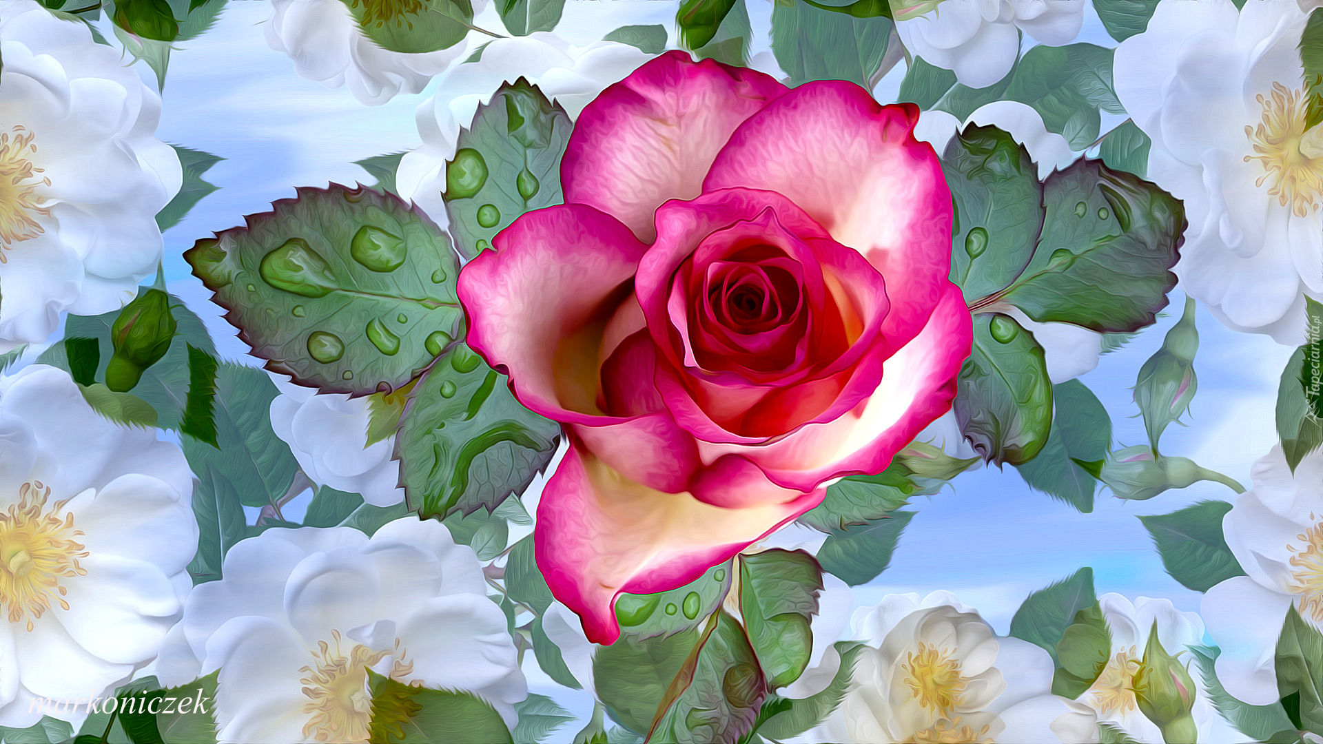 Edytor tapety: Róża z liśćmi w kroplach wody