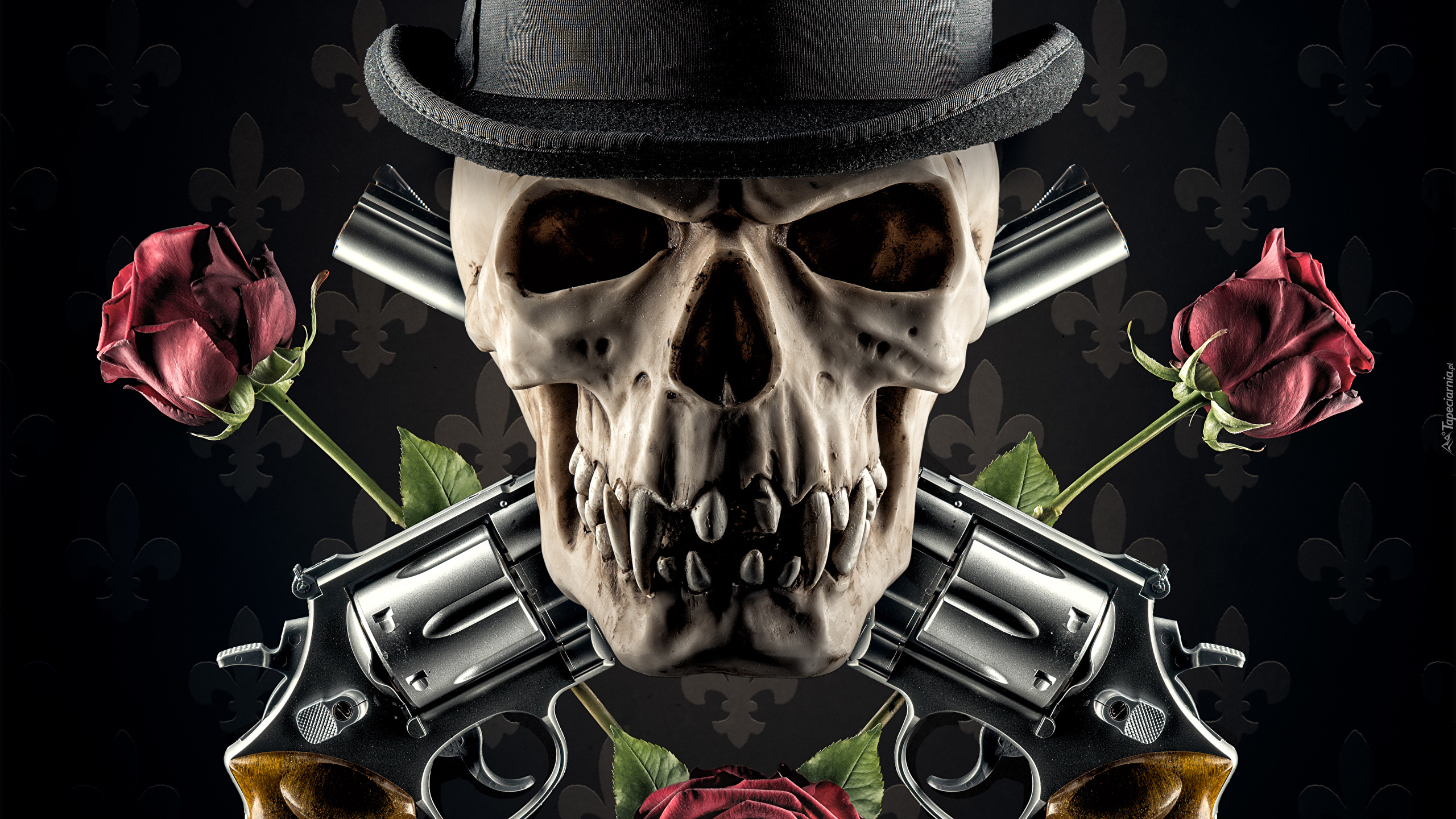 Edytor tapety: Czaszka w meloniku z rewolwerami i różami