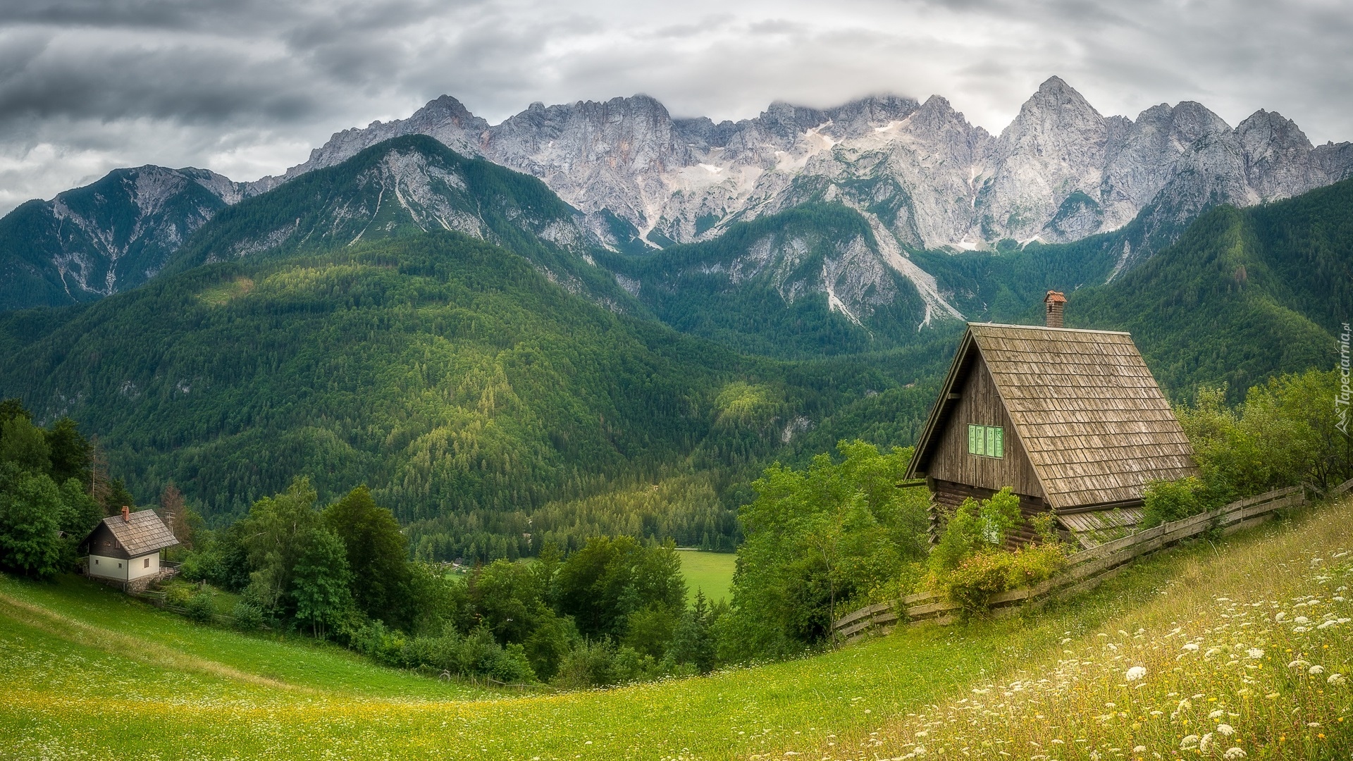 Edytor tapety: Domy na wzgórzu z widokiem na Alpy Julijskie