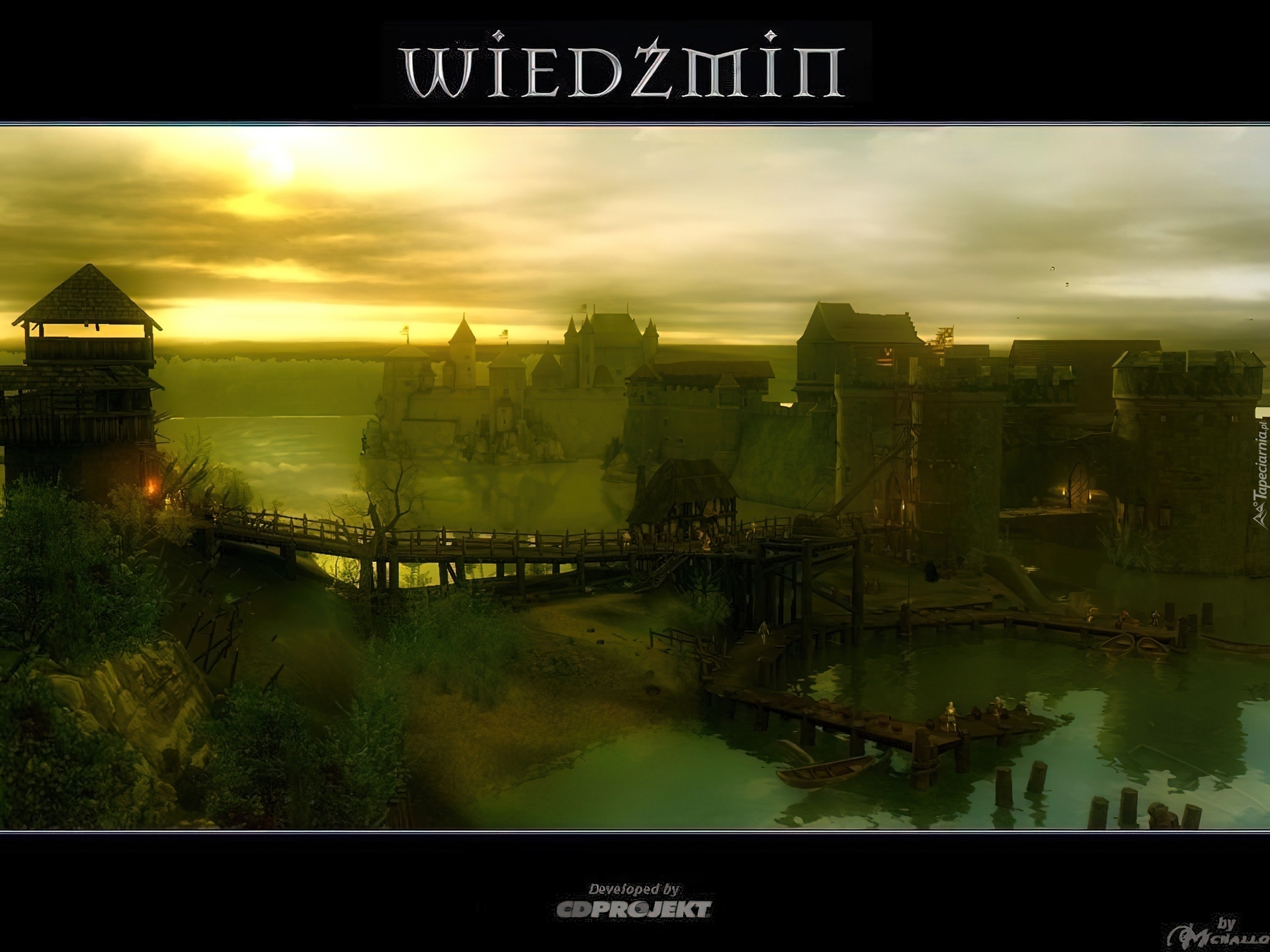 Edytor tapety: The Witcher, wioska, most, jezioro, chmury, słońce