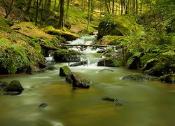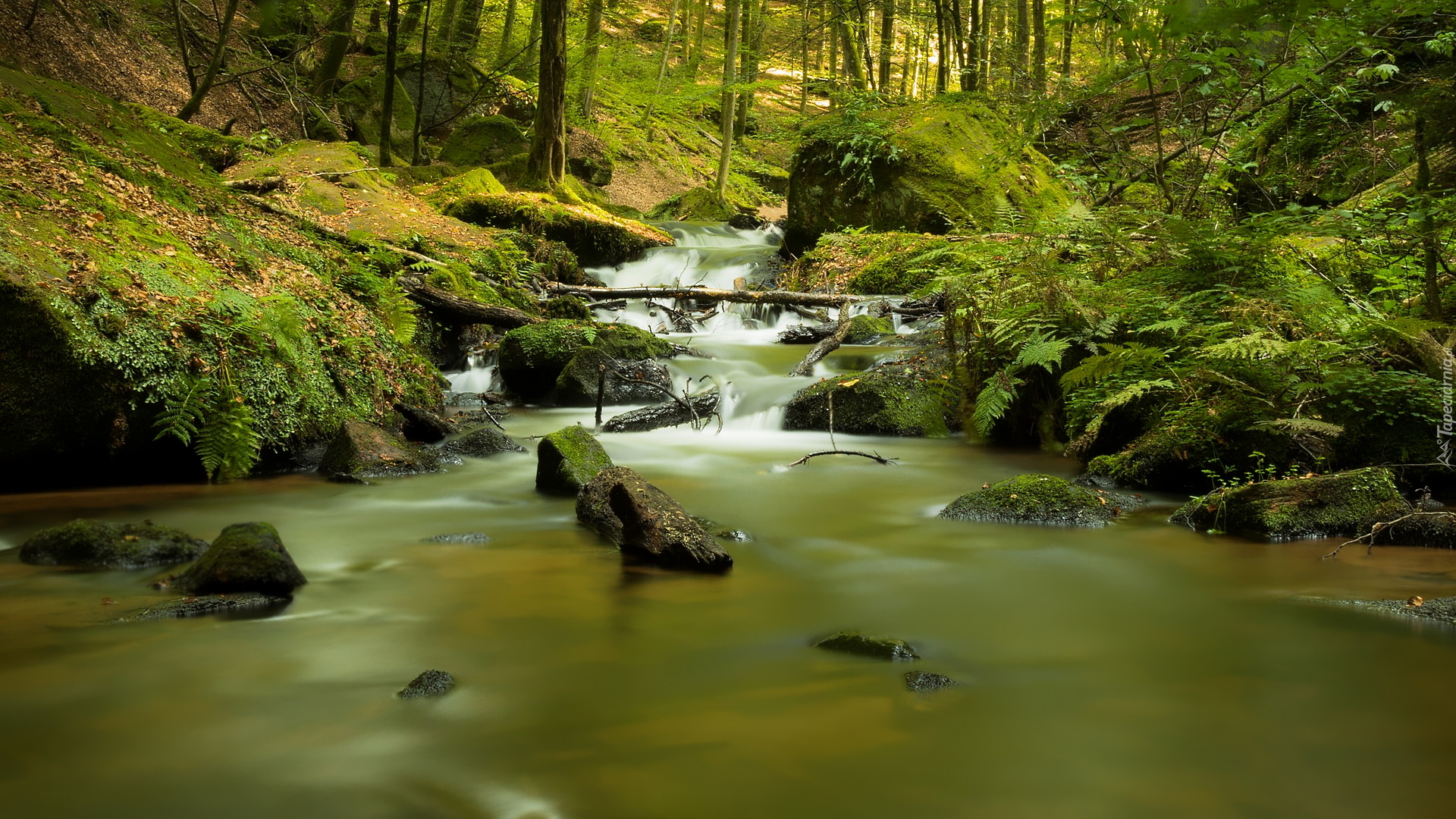 Edytor tapety: Omszałe kamienie i paprocie nad leśnym potokiem