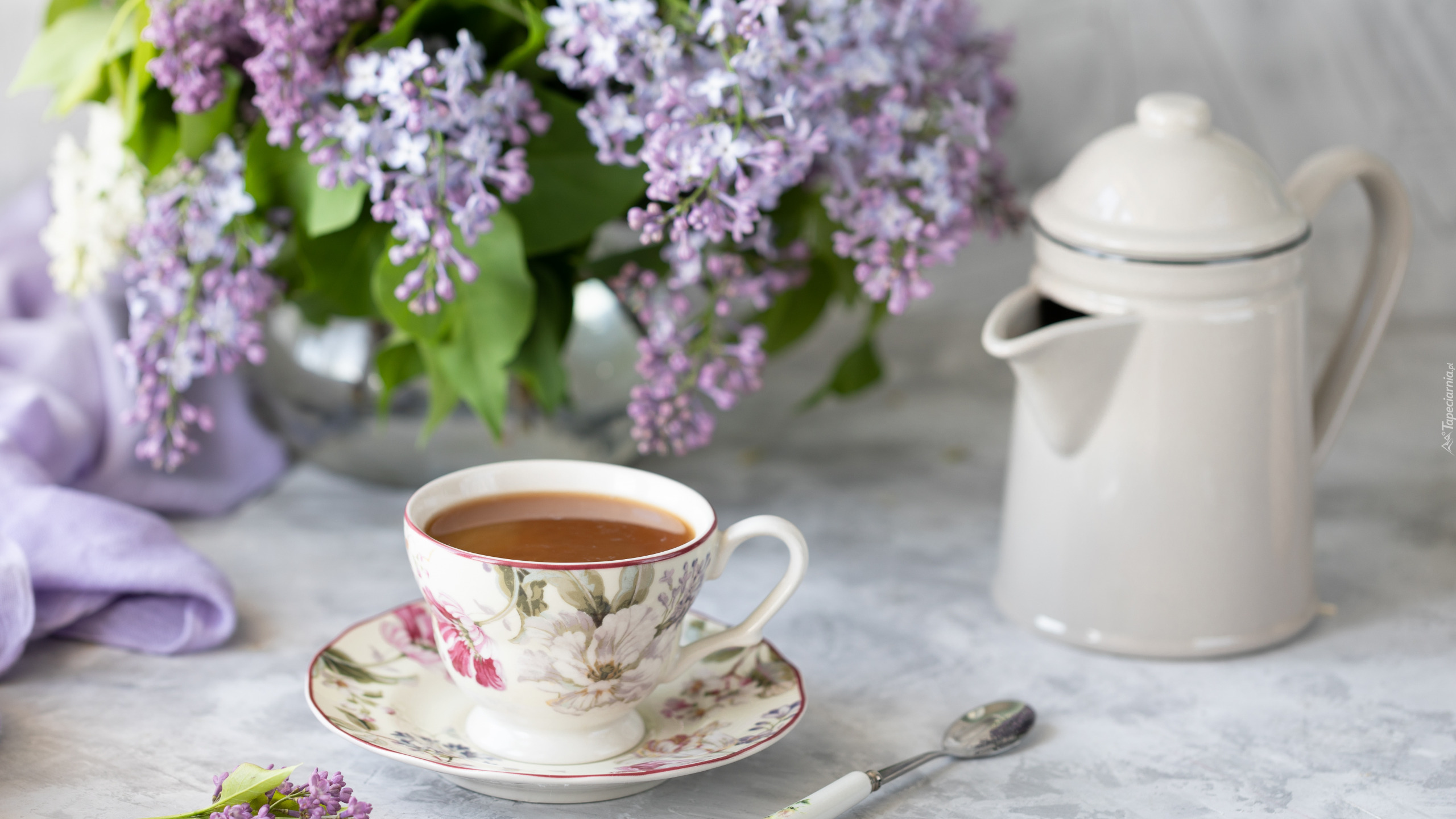 Edytor tapety: Filiżanka herbaty obok czajniczka i bzu