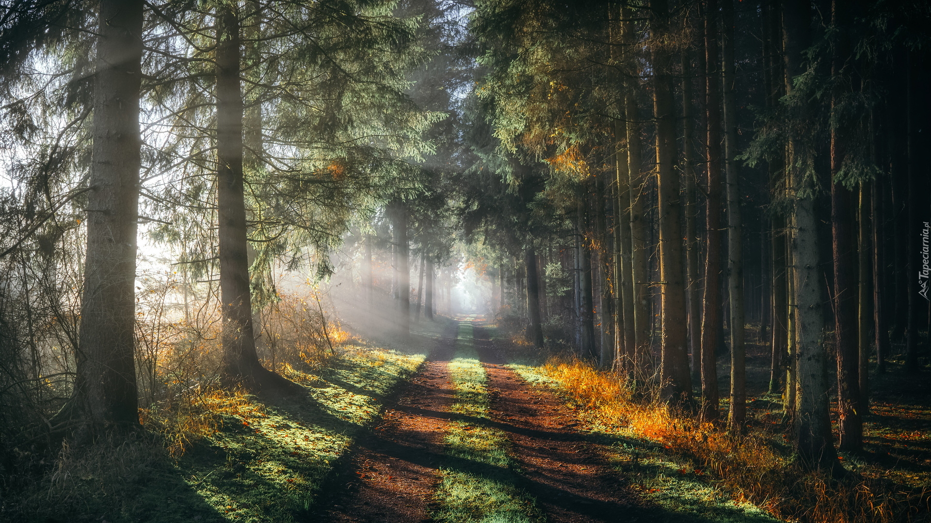 Edytor tapety: Promienie słońca na ścieżce w lesie