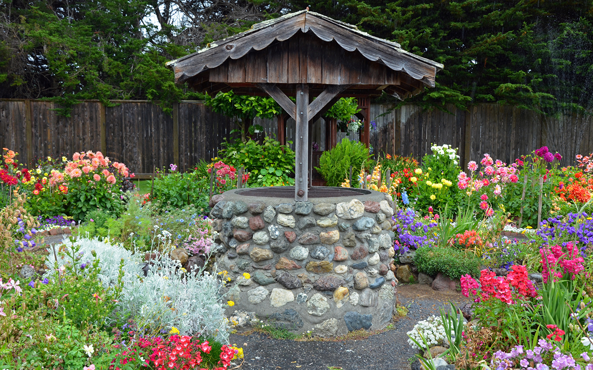 Edytor tapety: Kolorowe kwiaty obok kamiennej studni w ogrodzie