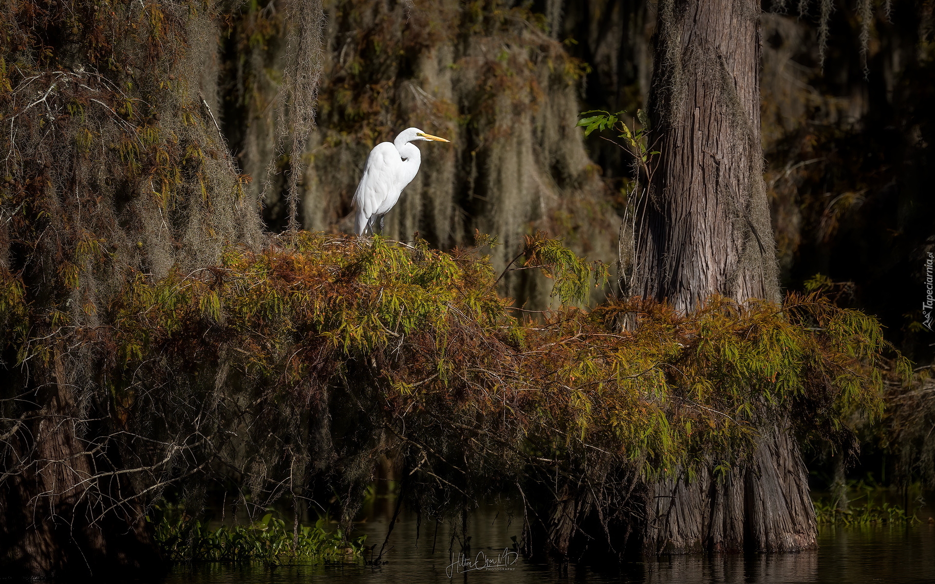 Edytor tapety: Biała czapla na gałęziach nad wodą