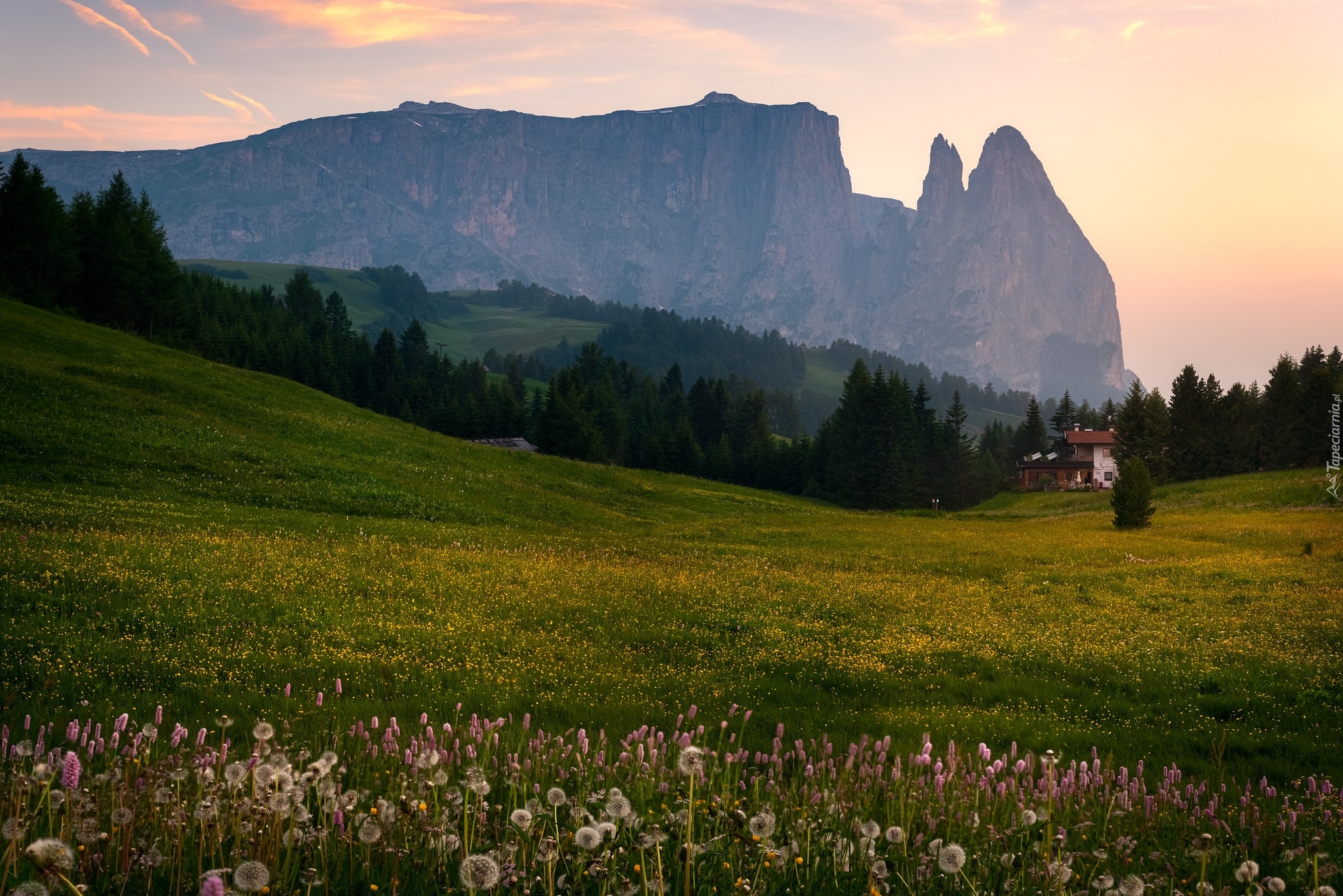 Edytor tapety: Widok z łąki na górę Schlern w Dolomitach