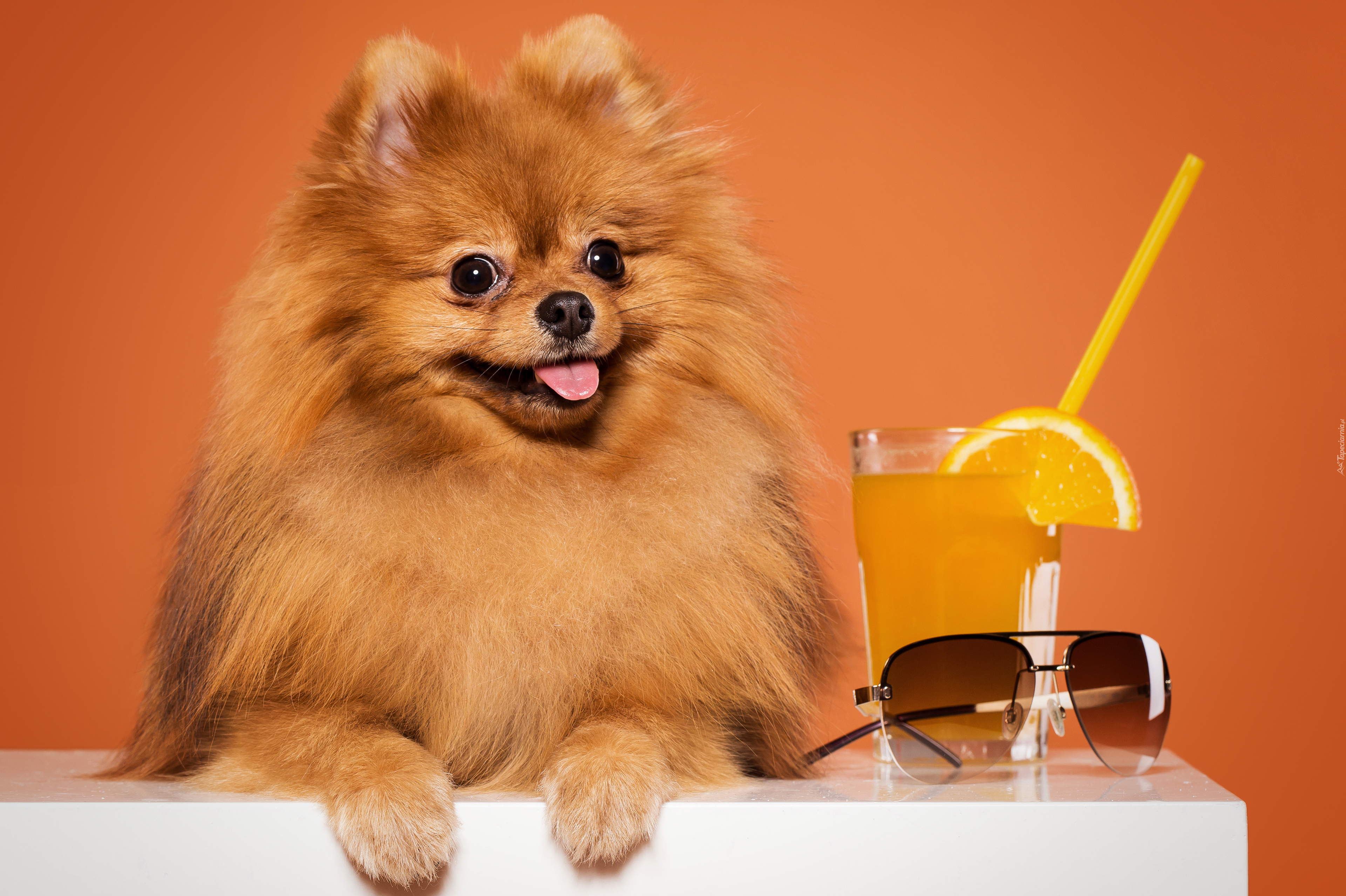 Edytor tapety: Szpic miniaturowy obok szklanki z sokiem