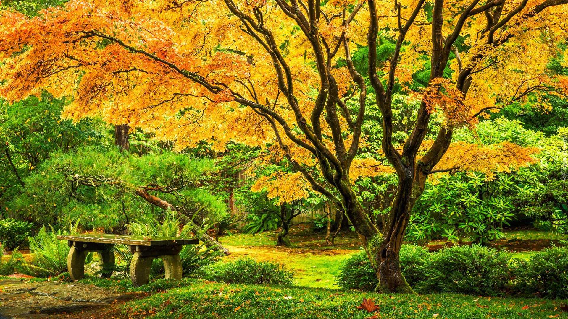 Edytor tapety: Ławeczka obok klonu japońskiego w Washington Park Arboretum