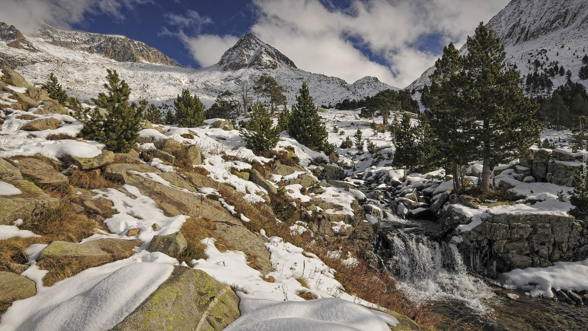 Edytor tapety: Drzewa na ośnieżonych skałach w górach