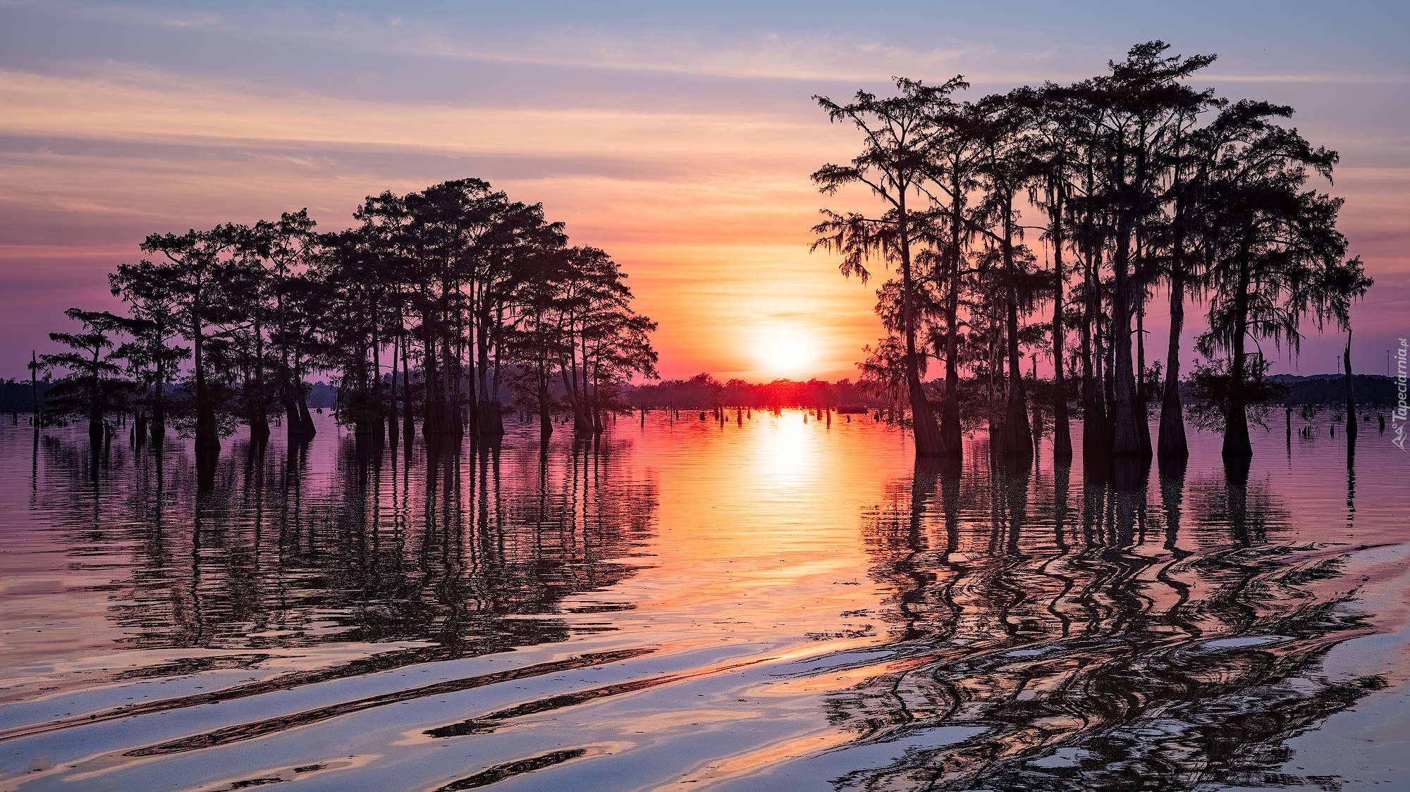 Edytor tapety: Cyprysy na mokradłach Atchafalaya Basin o zachodzie słońca