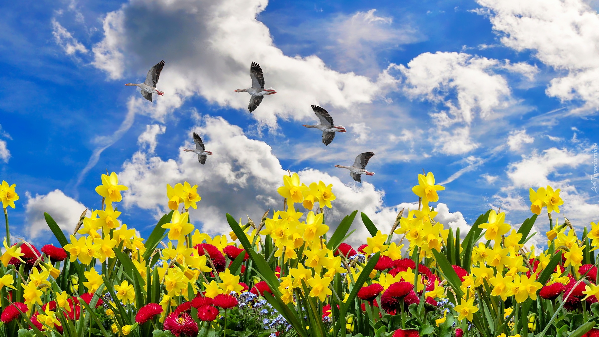 Edytor tapety: Narcyzy żonkile i gęsi na tle nieba