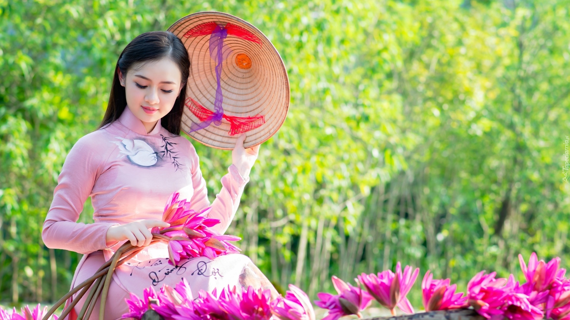 Edytor tapety: Azjatka obok kwiatów z kapeluszem w ręku