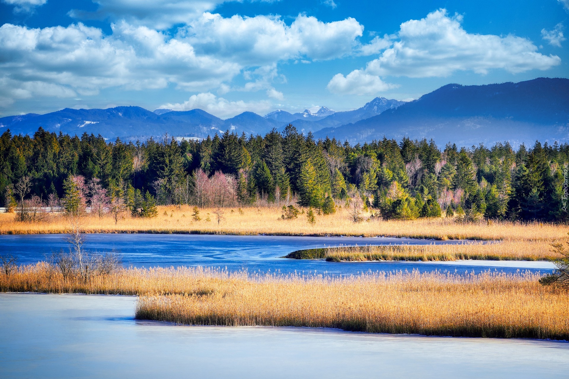 Edytor tapety: Trzciny na jeziorze z widokiem na góry