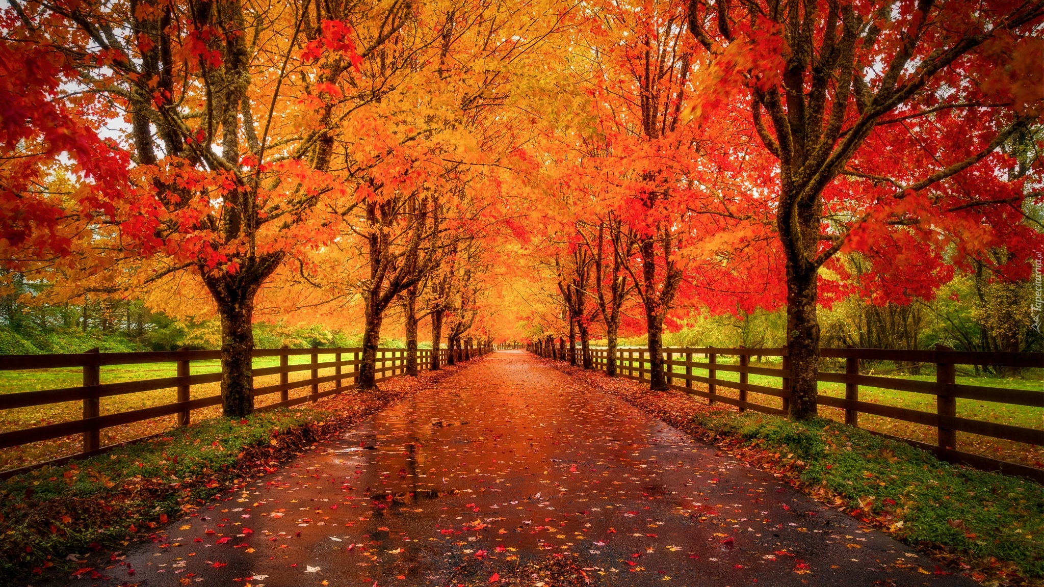 Edytor tapety: Drzewa przy płocie wzdłuż alejki