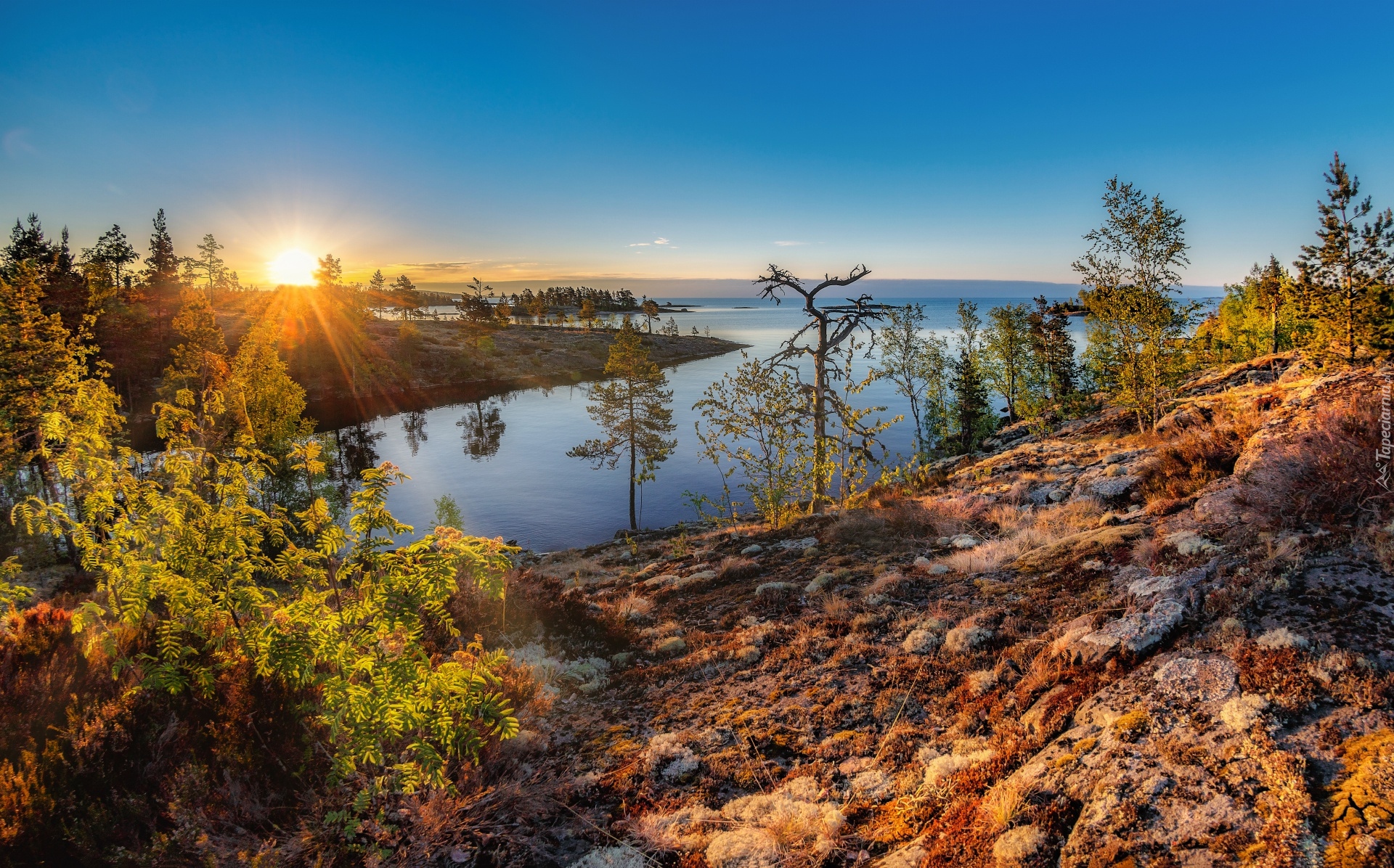Edytor tapety: Drzewa i jezioro w blasku wschodzącego słońca