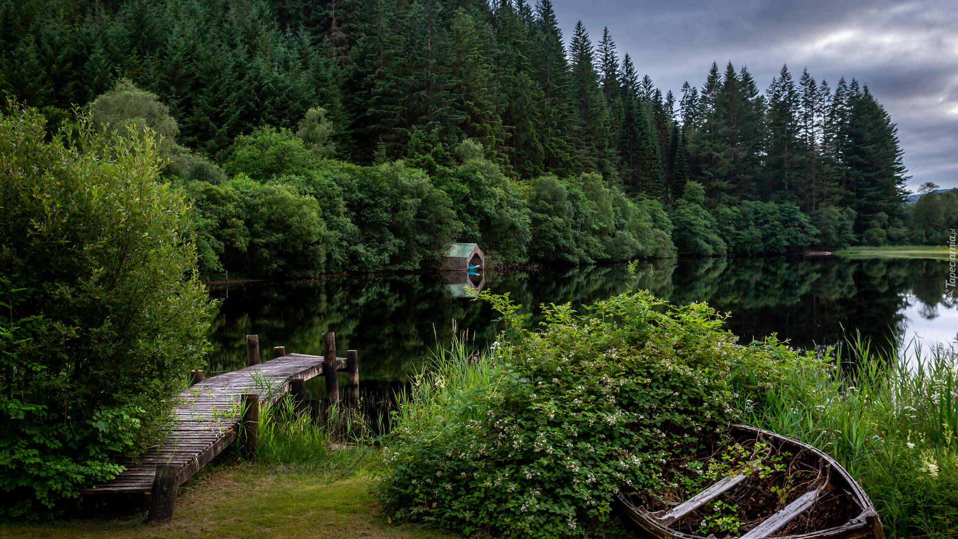 Edytor tapety: Łódka w krzewach na brzegu jeziora