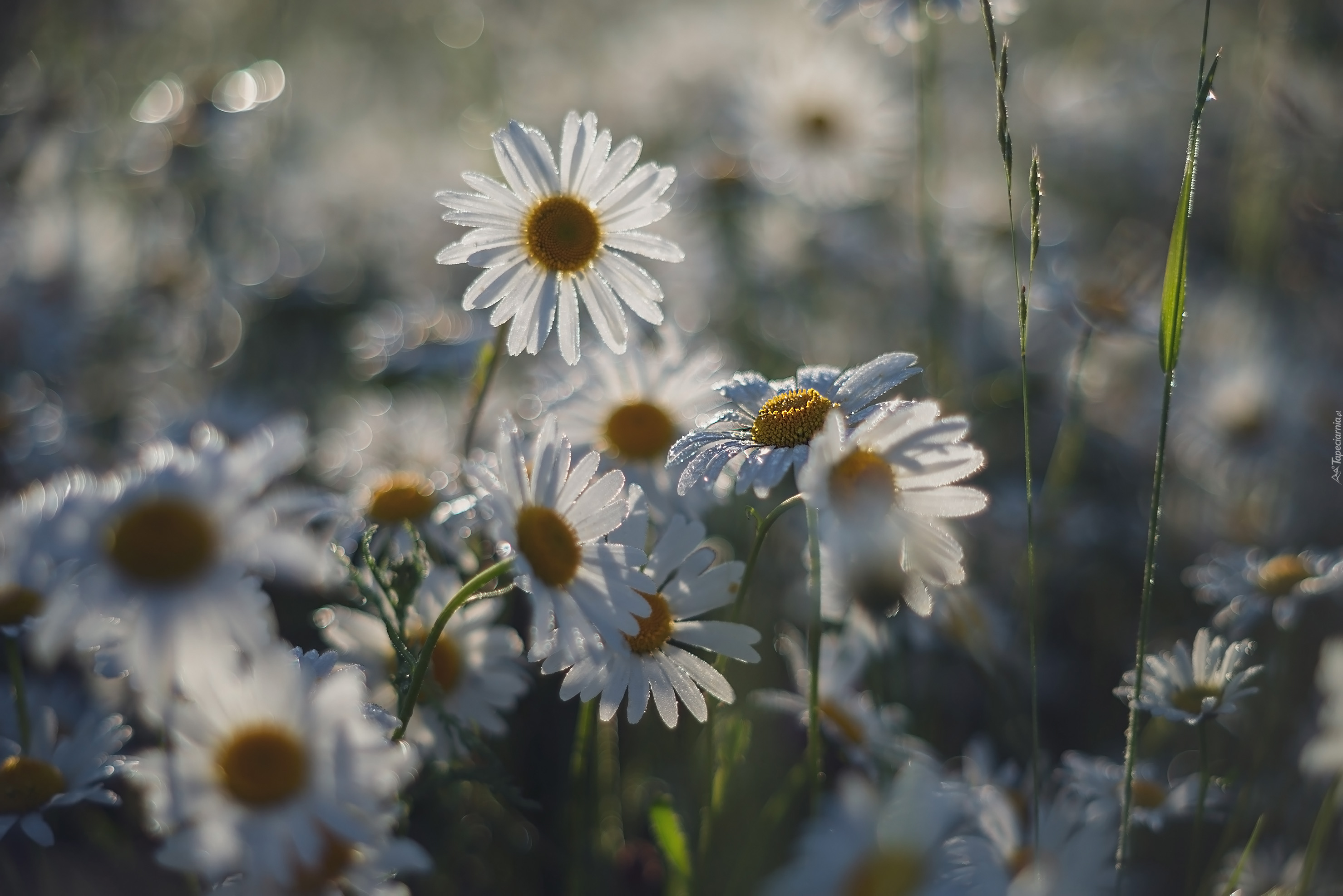 Edytor tapety: Krople rosy na rozświetlonych rumiankach