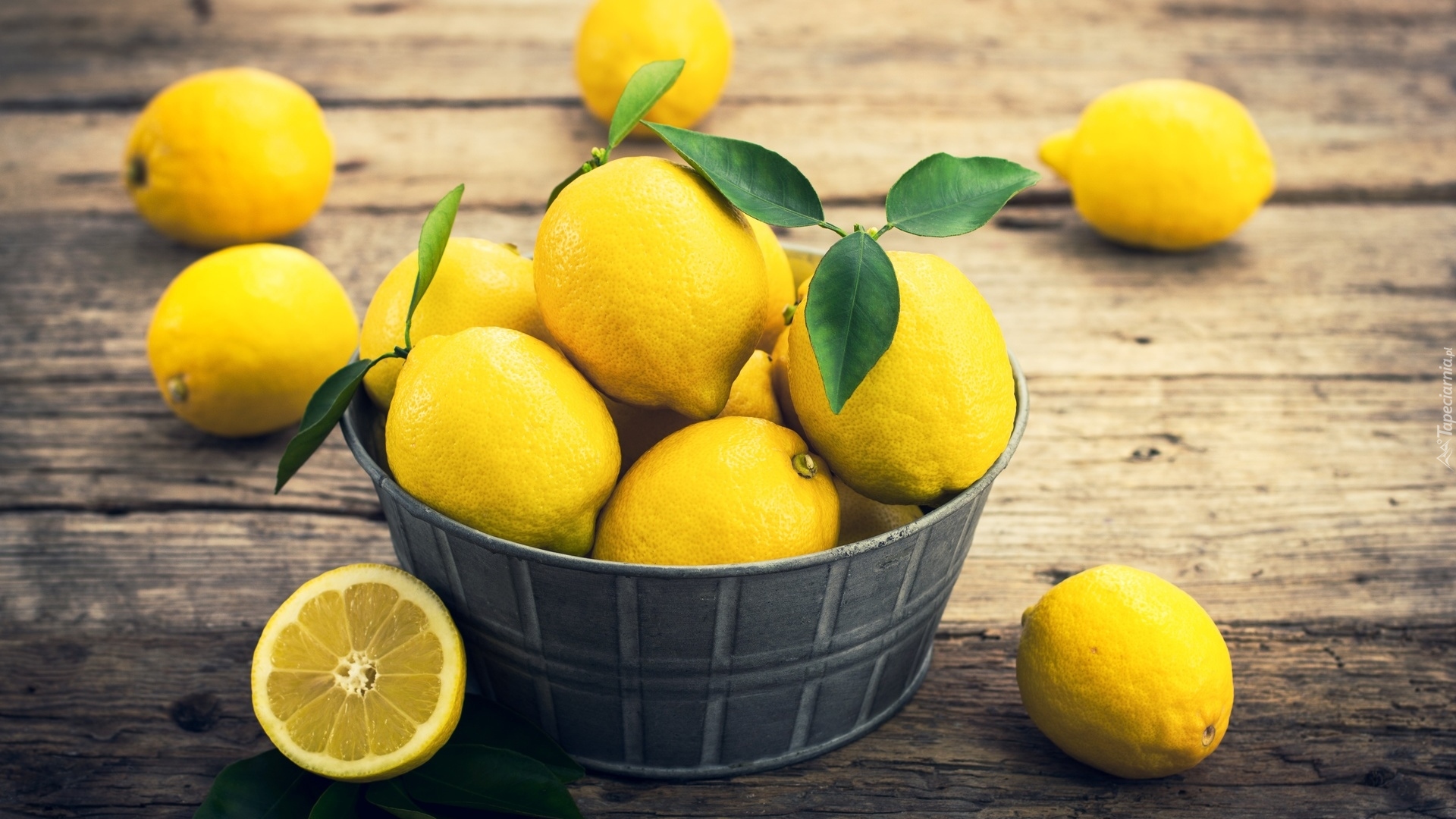 Edytor tapety: Cytryny w pojemniku i obok na deskach