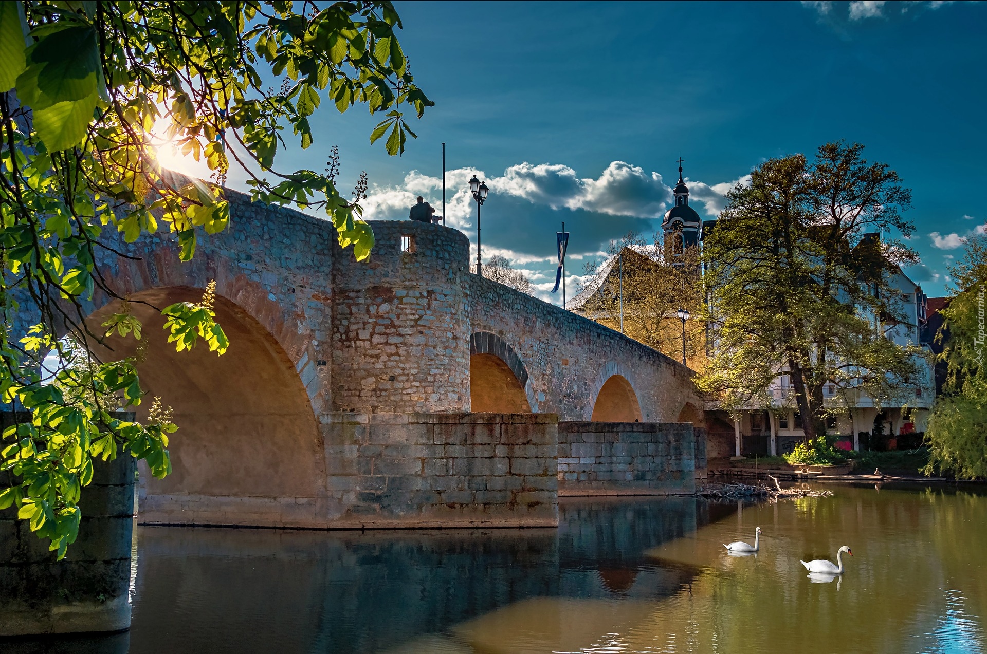 Edytor tapety: Łabędzie na rzece obok mostu