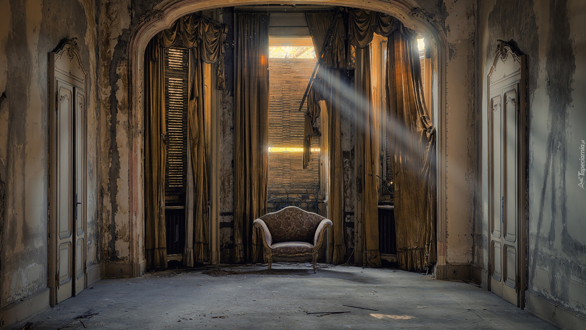 Edytor tapety: Fotel przy oknie w zaniedbanym pokoju
