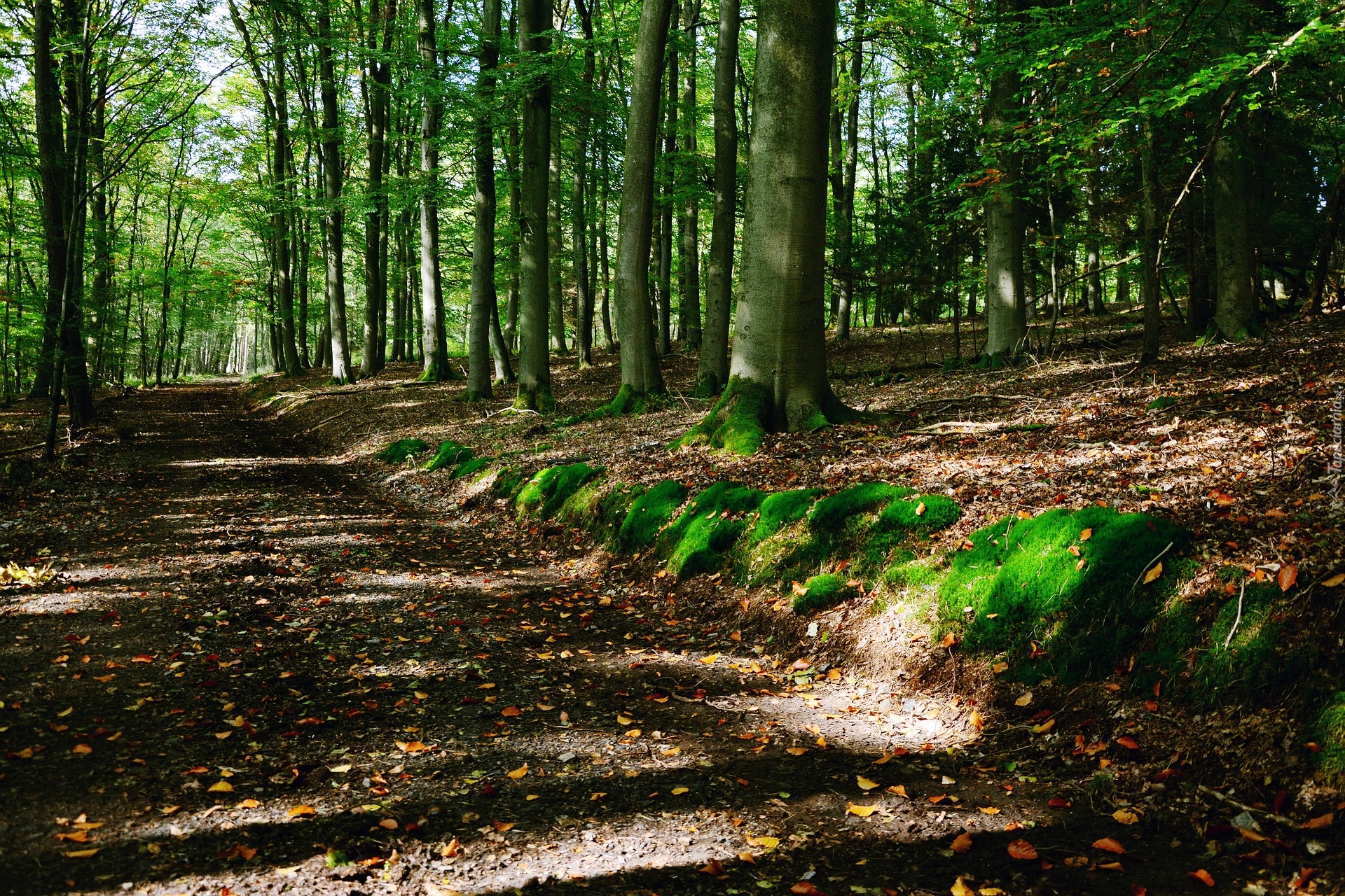Edytor tapety: Mech przy drodze w zielonym lesie