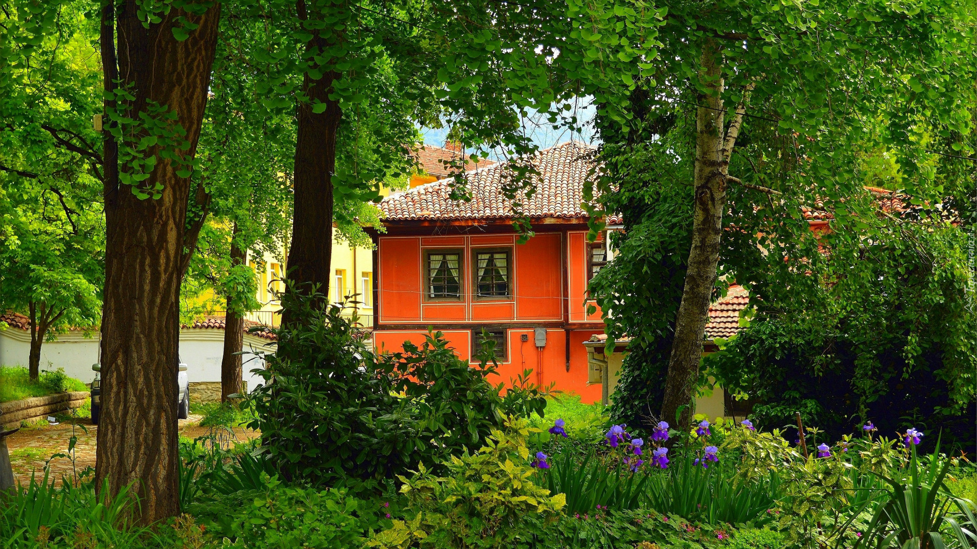 Edytor tapety: Widok zza drzew na pomarańczowy dom