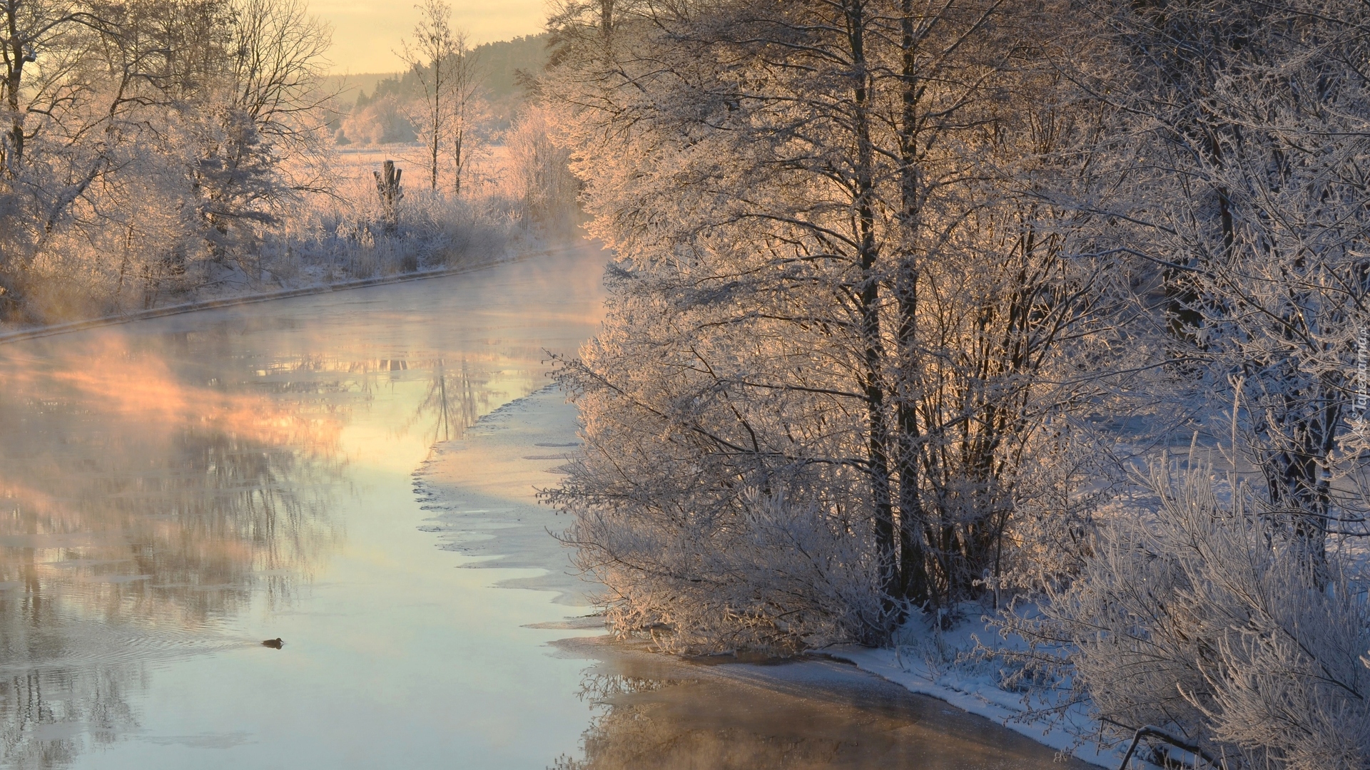 Edytor tapety: Oszronione drzewa nad rzeką w słonecznym blasku