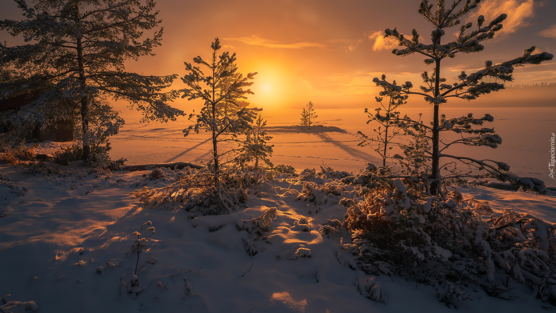 Edytor tapety: Zachód słońca nad zaśnieżonym jeziorem w Ringerike