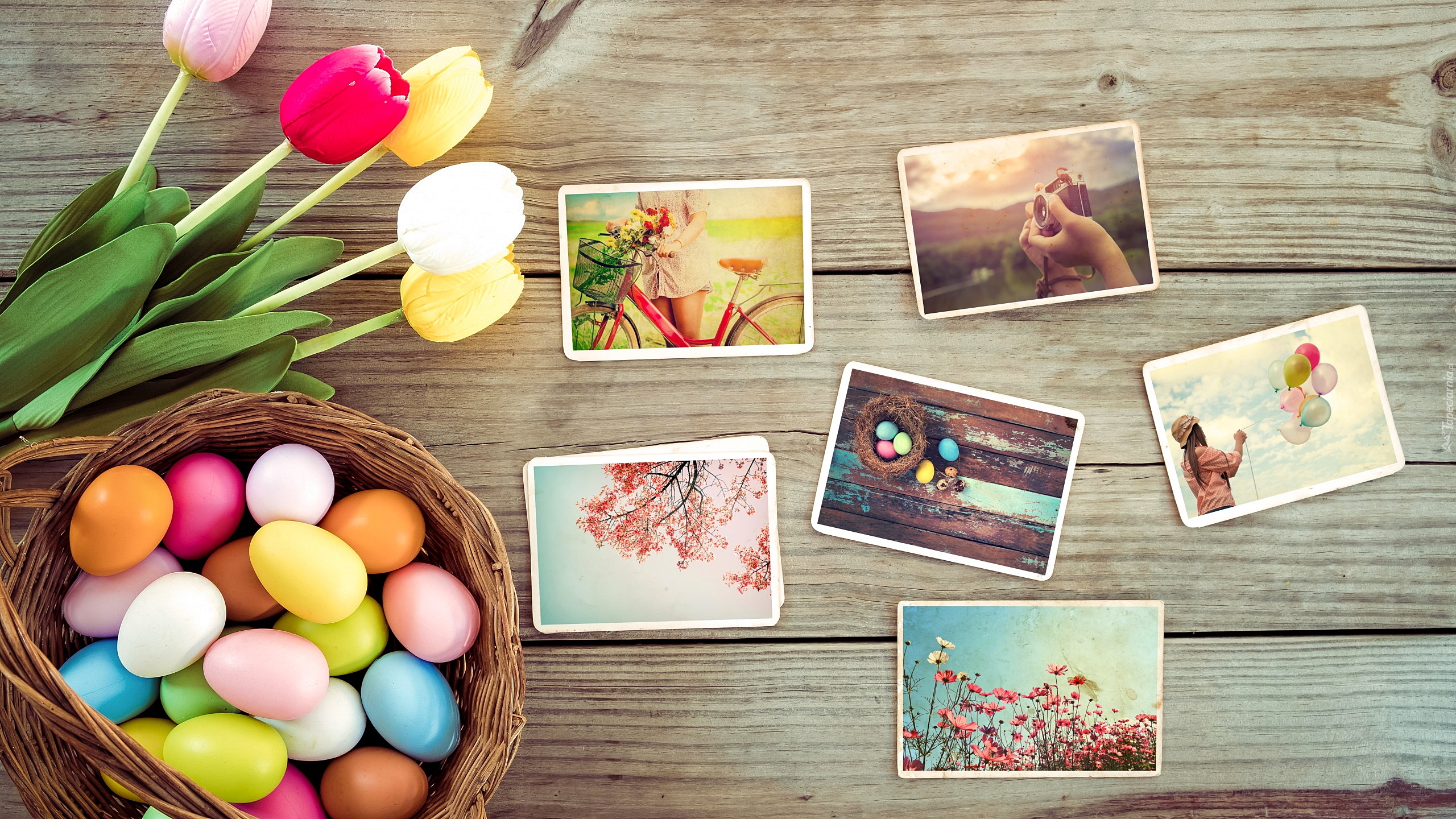 Edytor tapety: Pisanki obok zdjęć na deskach