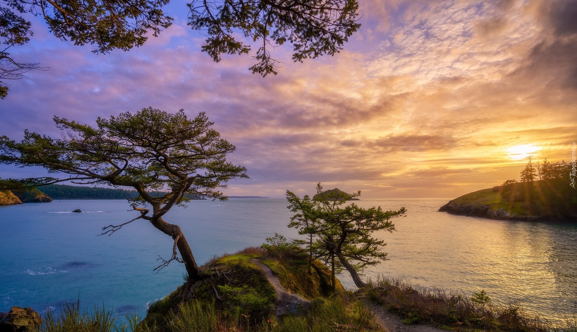 Edytor tapety: Drzewa w blasku słońca na skale nad morzem
