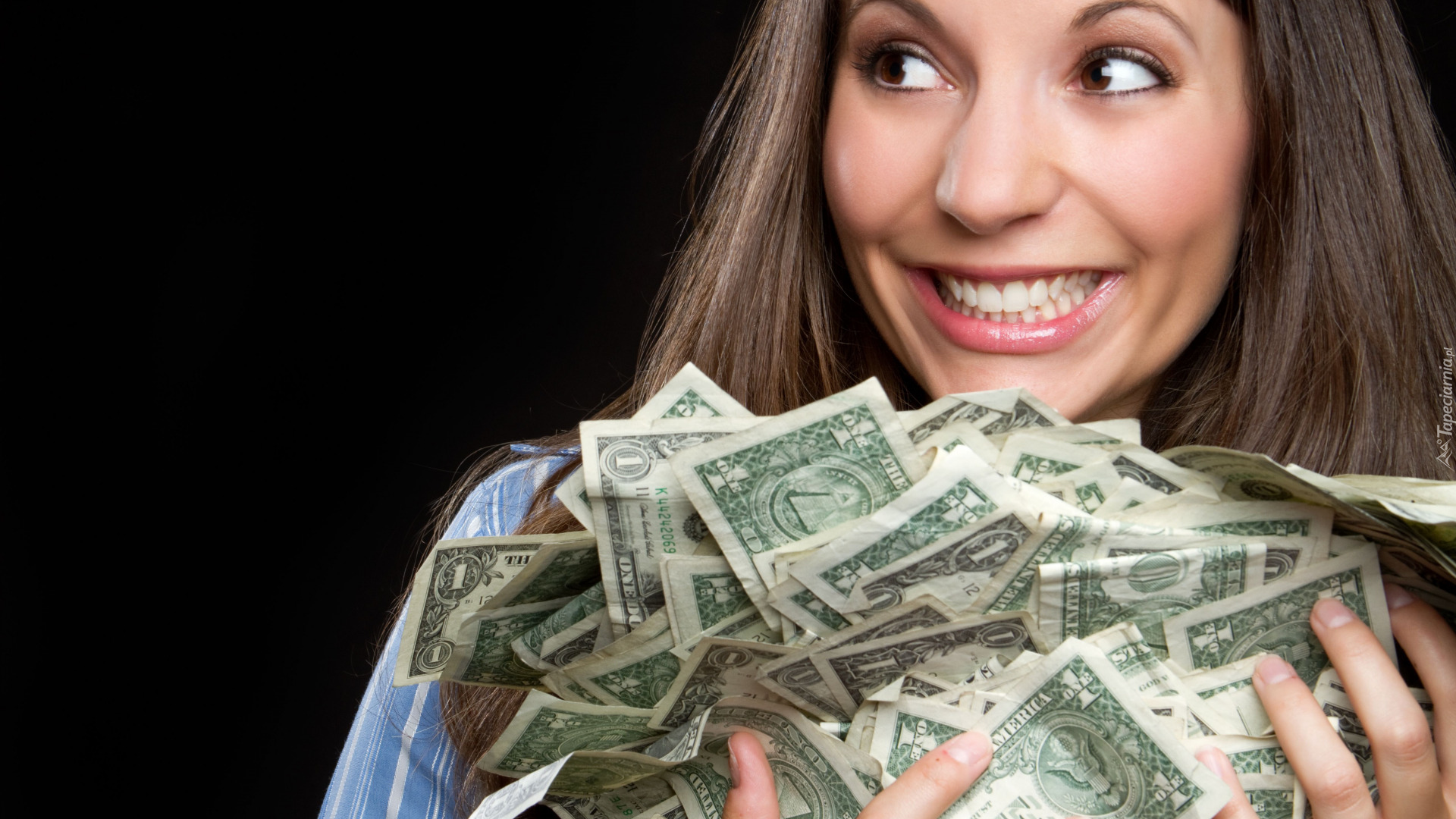 Edytor tapety: Kobieta z banknotami dolarów w dłoniach