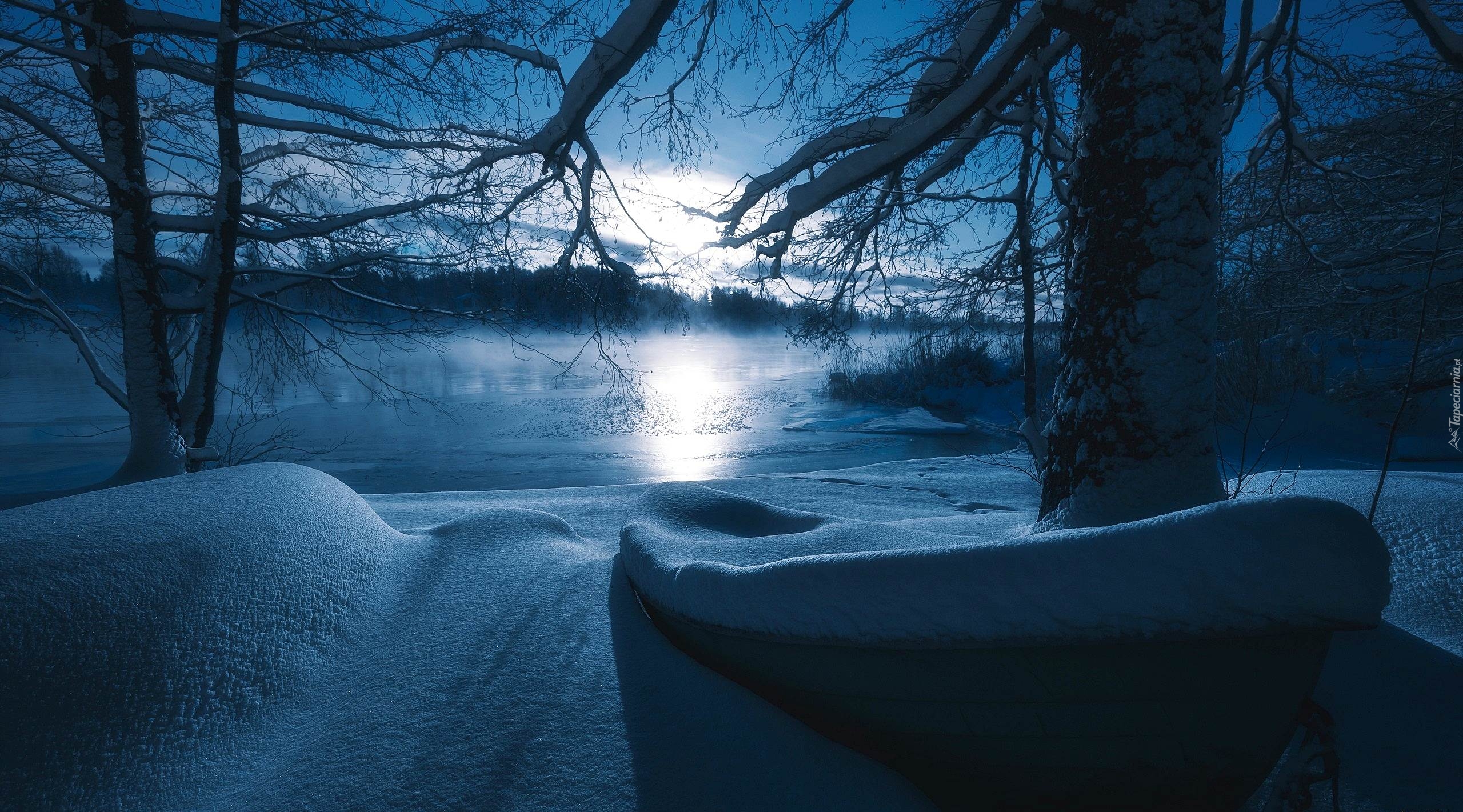 Edytor tapety: Zaśnieżona łódka na brzegu jeziora