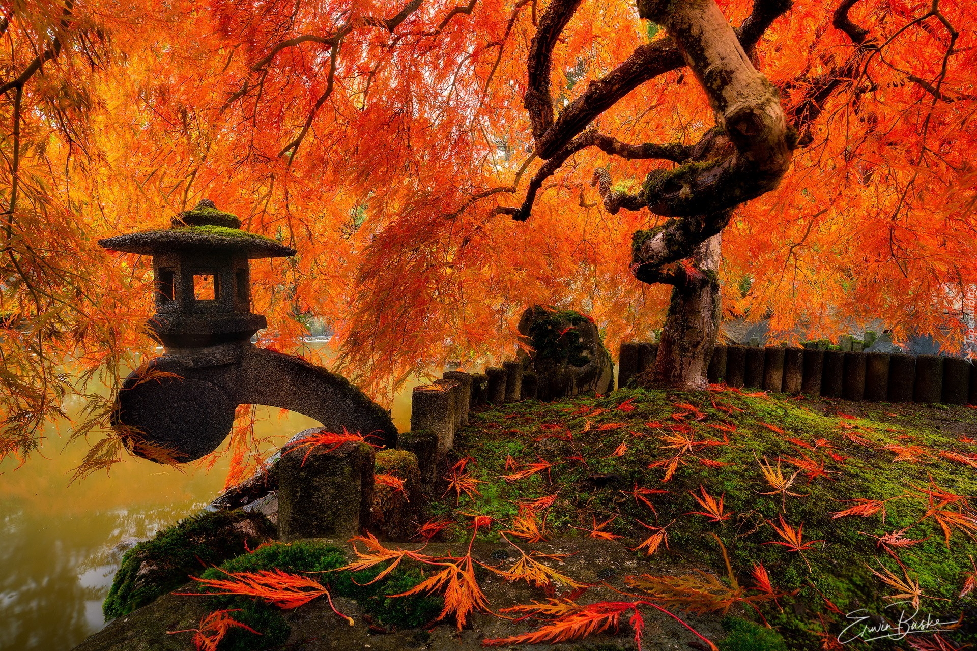 Edytor tapety: Klon japoński przy ogrodzeniu nad stawem