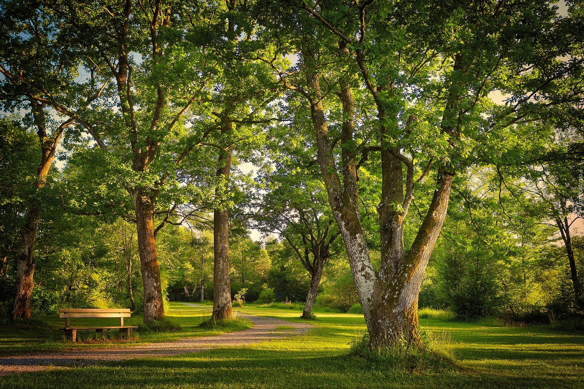 Edytor tapety: Ławka w parku pod drzewami