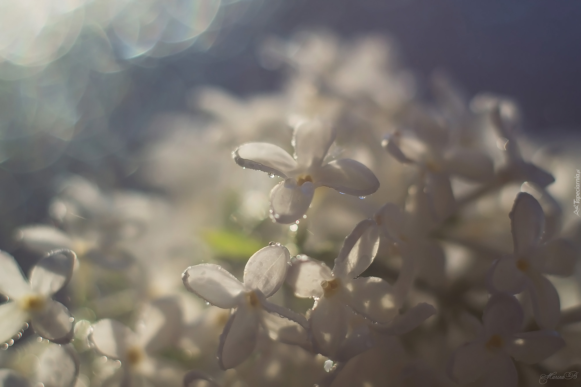 Edytor tapety: Białe kwiaty bzu w kroplach rosy