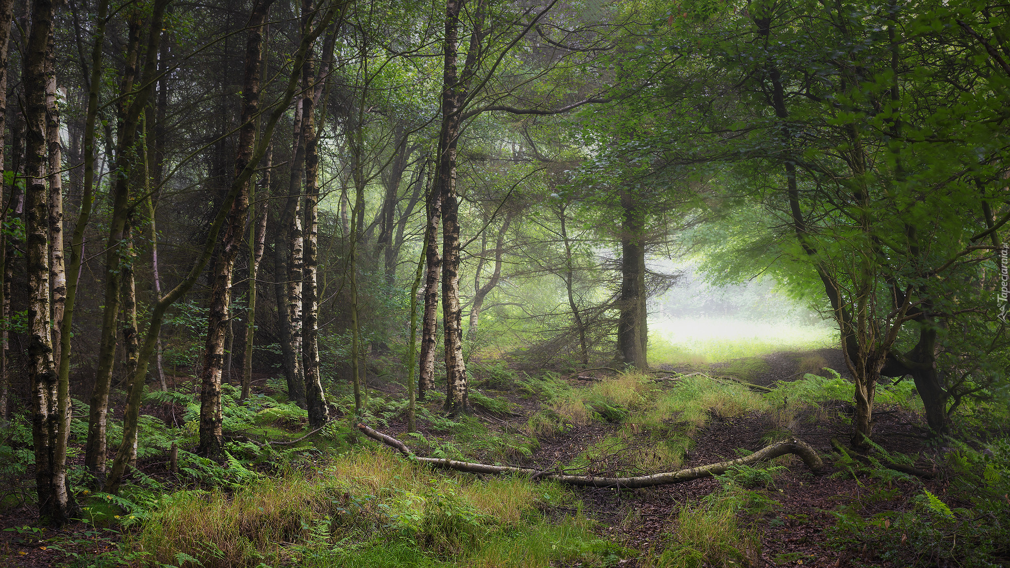 Edytor tapety: Brzozowy zagajnik w zamglonym lesie