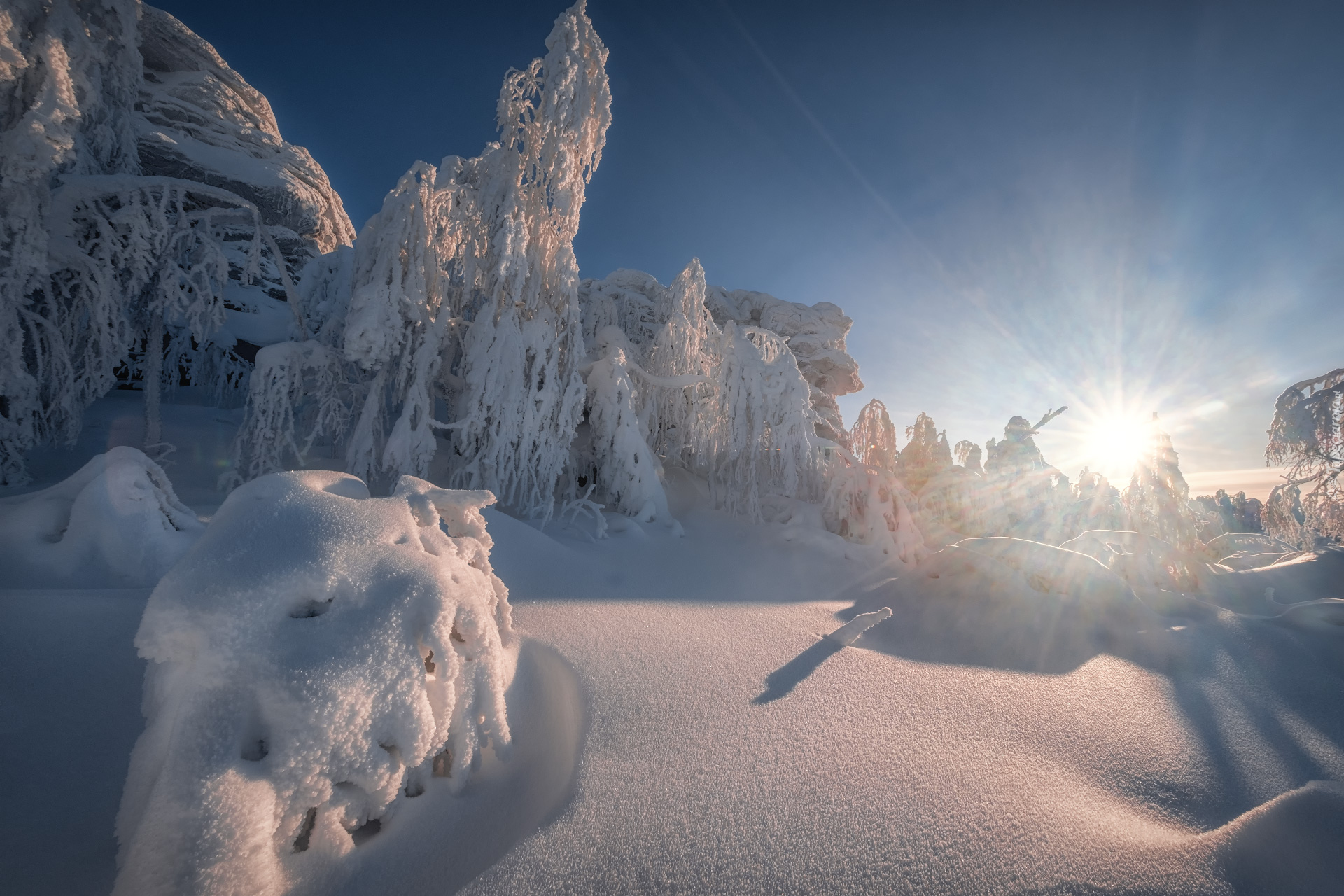 Edytor tapety: Zasypane śniegiem drzewa w słonecznych promieniach