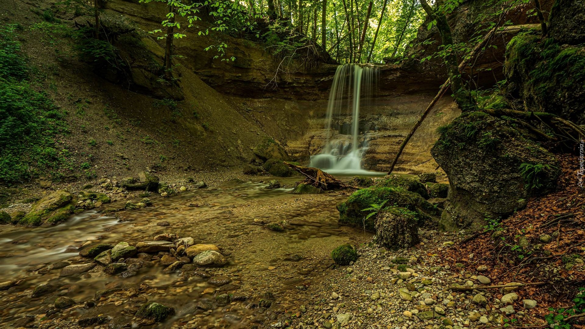 Edytor tapety: Mały wodospad wpadający do strumyka w lesie