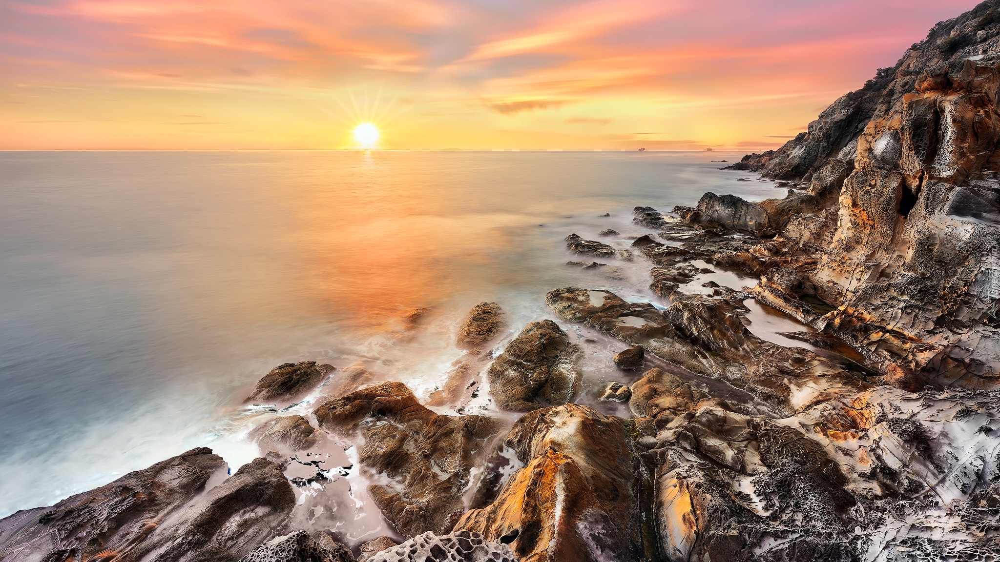Edytor tapety: Skalisty brzeg morza o wschodzie słońca