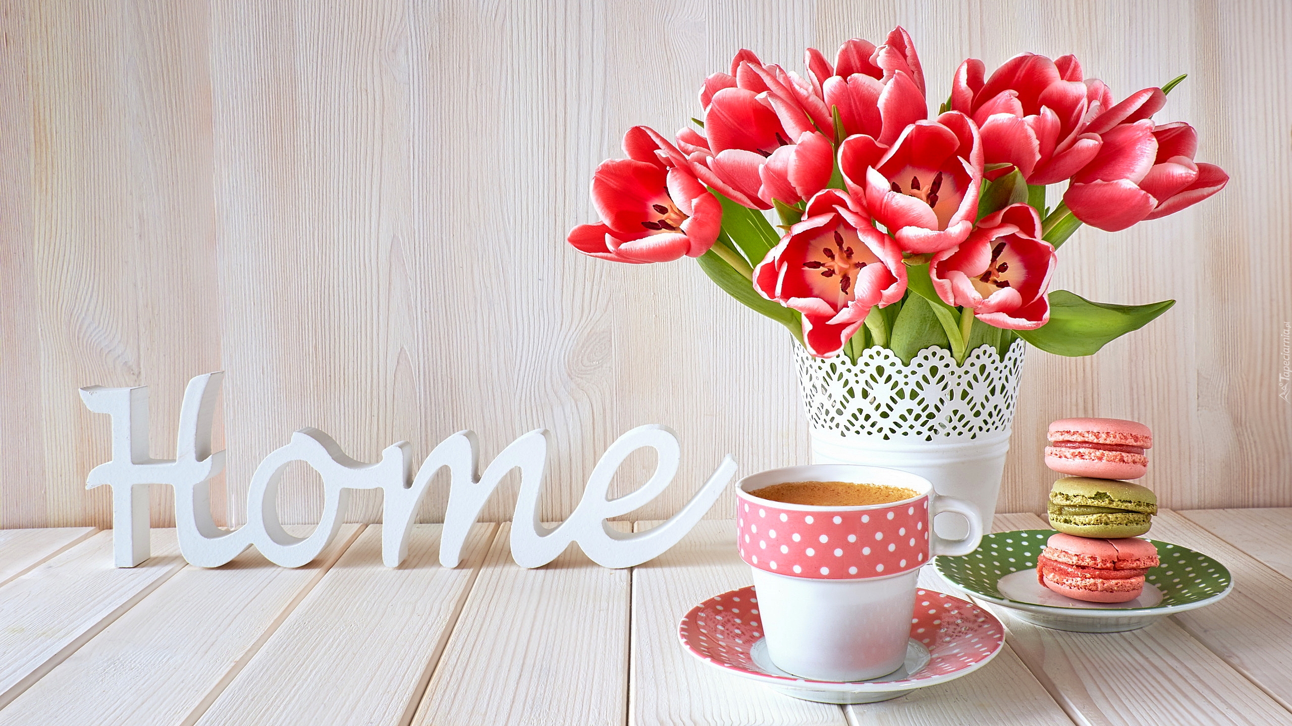 Edytor tapety: Napis home obok tulipanów i kubka kawy
