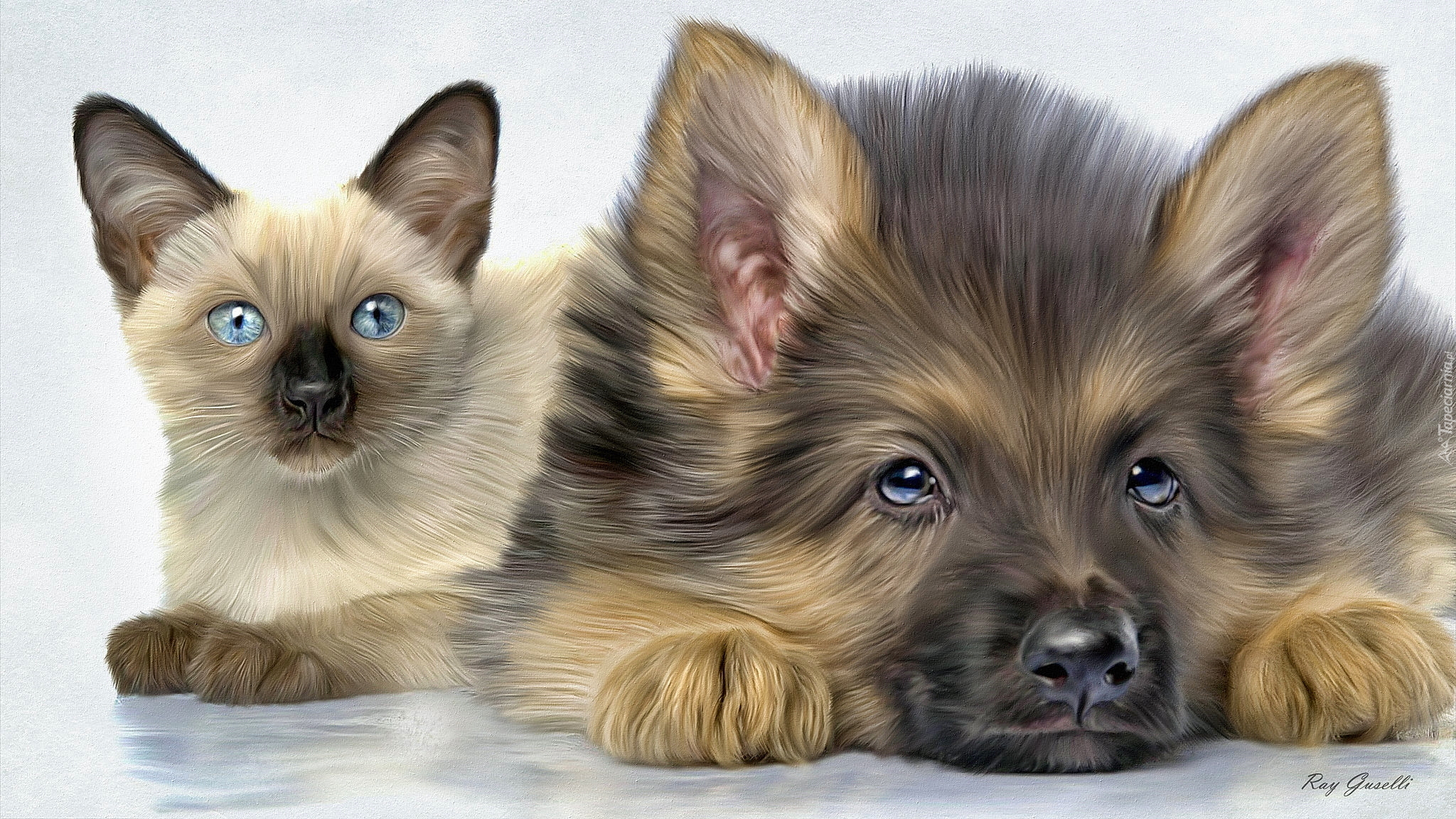 Edytor tapety: Kot syjamski i szczeniak owczarka w grafice