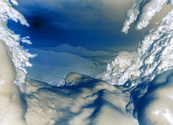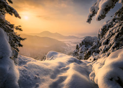 Edytor tapety: Ośnieżone drzewa na tle gór w zamglonym słońcu