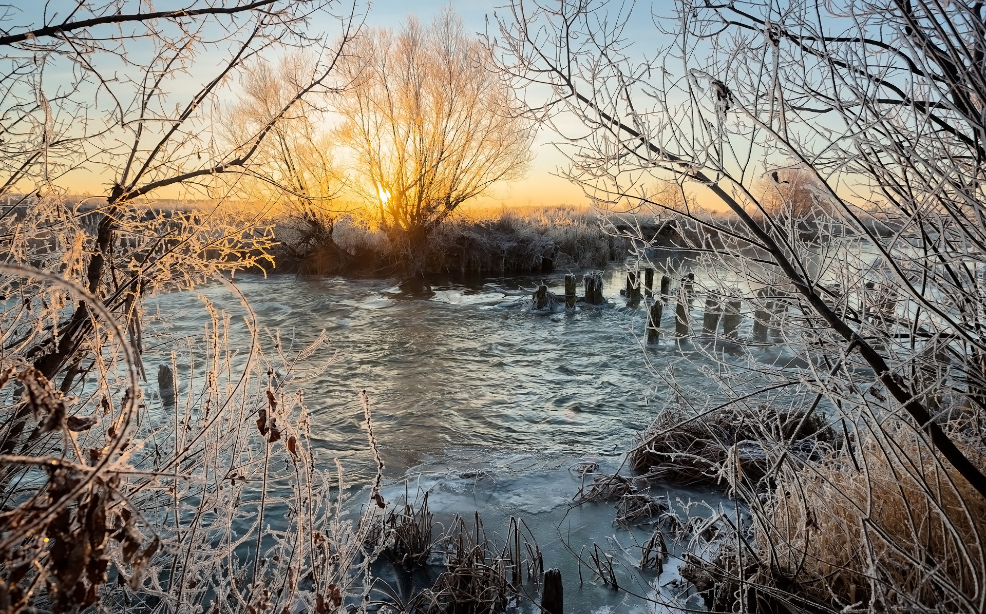 Edytor tapety: Oszronione drzewa nad rzeką w zachodzącym słońcu