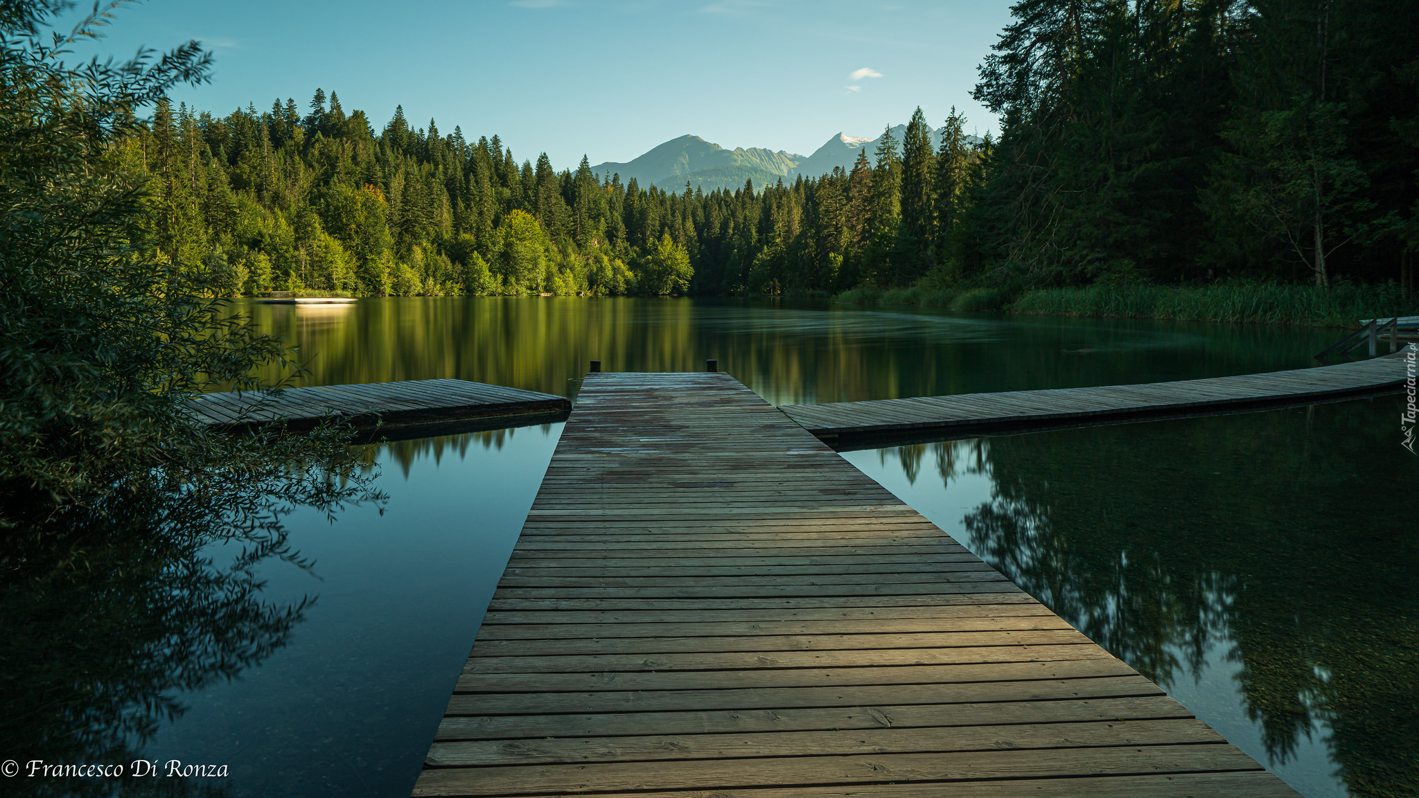 Edytor tapety: Pomosty nad jeziorem i wierzchołki gór w tle